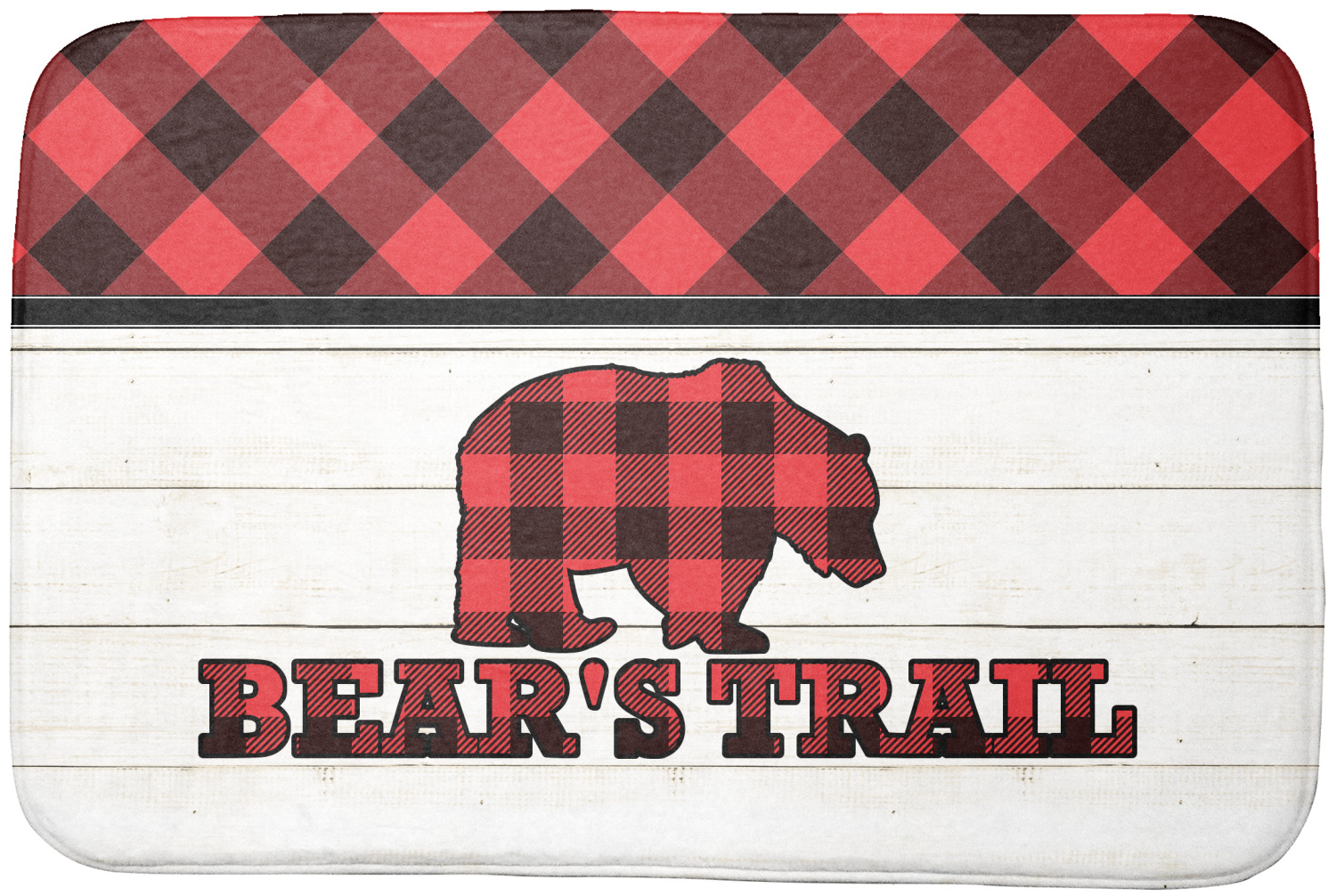 The main design is split into two asymmetrical sections. The top section is a diagonal red and black plaid, while the bottom is a light wood texture. On top of the wood texture is where your graphic and personalization go! The bear graphic and text below are filled with another black and red plaid.