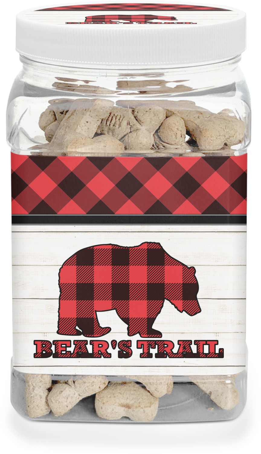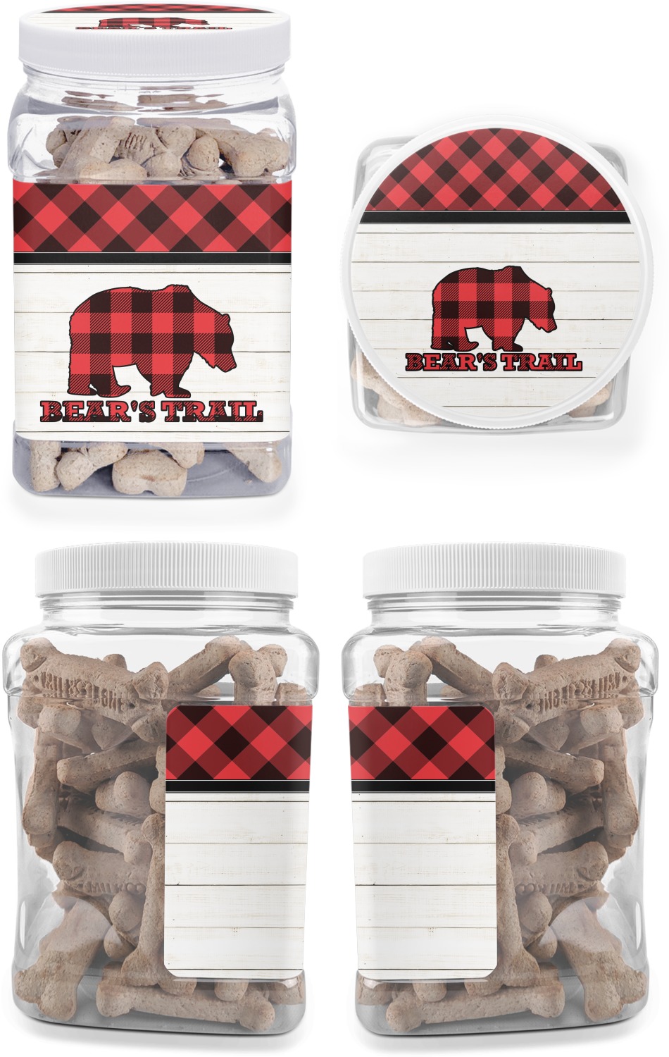 This half gallon jar, made from a sturdy plastic, is the perfect way to keep treats from any naughty pet paws, while still keeping them ready on hand for when your pup performs an impressive trick. This dog cookie jar features a screw-on, white lid that displays your personalized design on a vinyl sticker. We apply another customized sticker that wraps around the front and sides of the jar. Our dog treat jar also has indentations on the rear ends of the sides, which allows for convenient handling, and its square frame allows for easy storage.