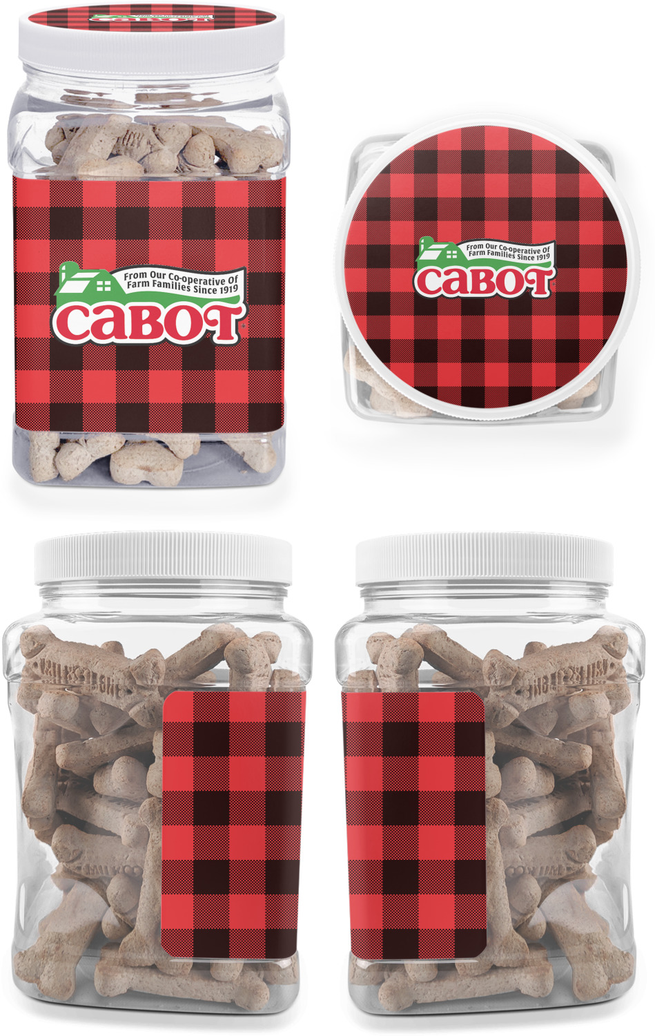 This half gallon jar, made from a sturdy plastic, is the perfect way to keep treats from any naughty pet paws, while still keeping them ready on hand for when your pup performs an impressive trick. This dog cookie jar features a screw-on, white lid that displays your personalized design on a vinyl sticker. We apply another customized sticker that wraps around the front and sides of the jar. Our dog treat jar also has indentations on the rear ends of the sides, which allows for convenient handling, and its square frame allows for easy storage.