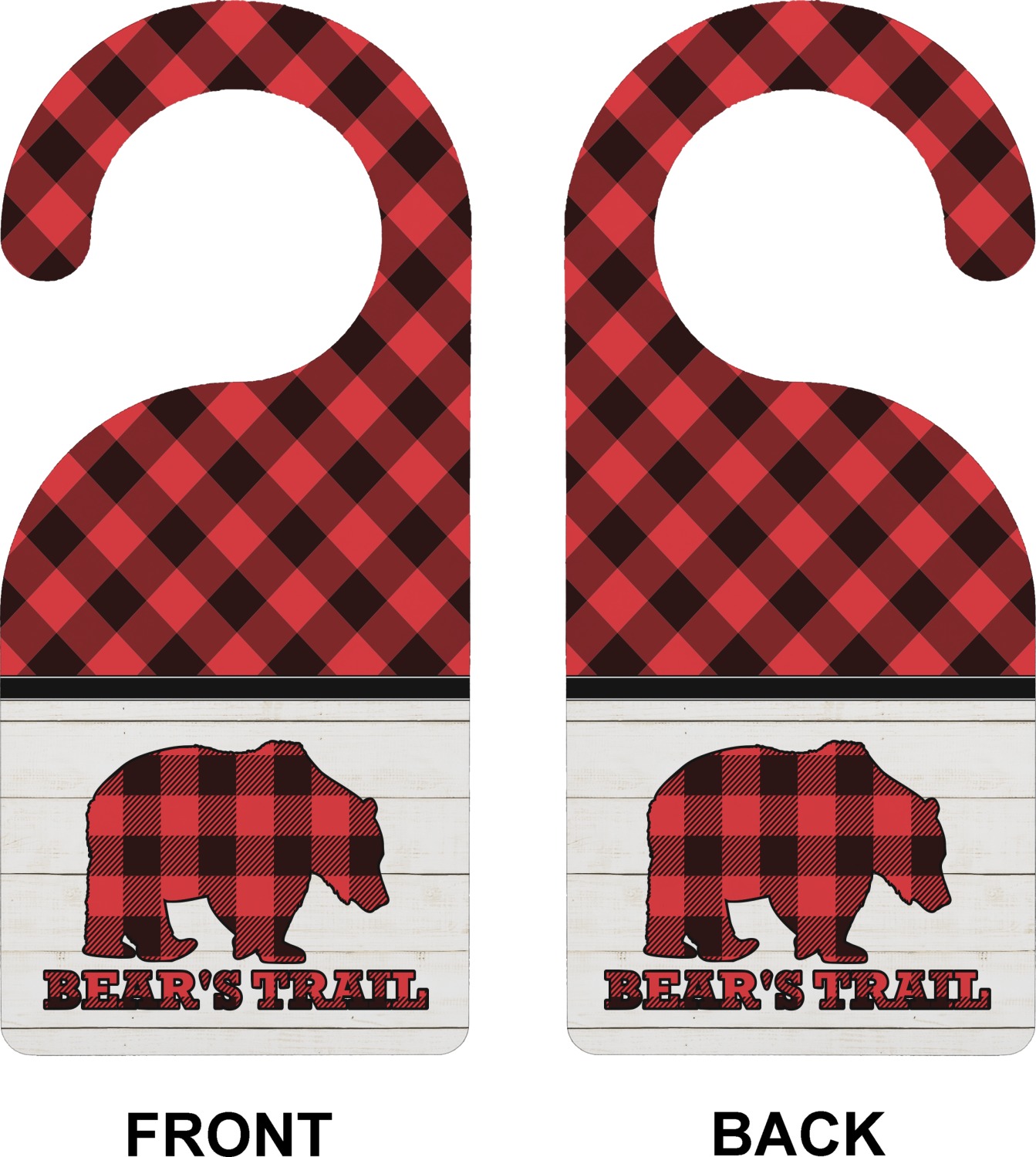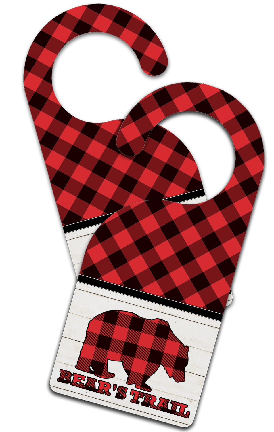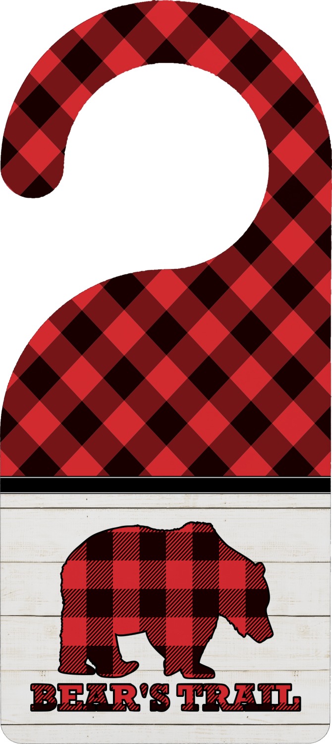 The main design is split into two asymmetrical sections. The top section is a diagonal red and black plaid, while the bottom is a light wood texture. On top of the wood texture is where your graphic and personalization go! The bear graphic and text below are filled with another black and red plaid.