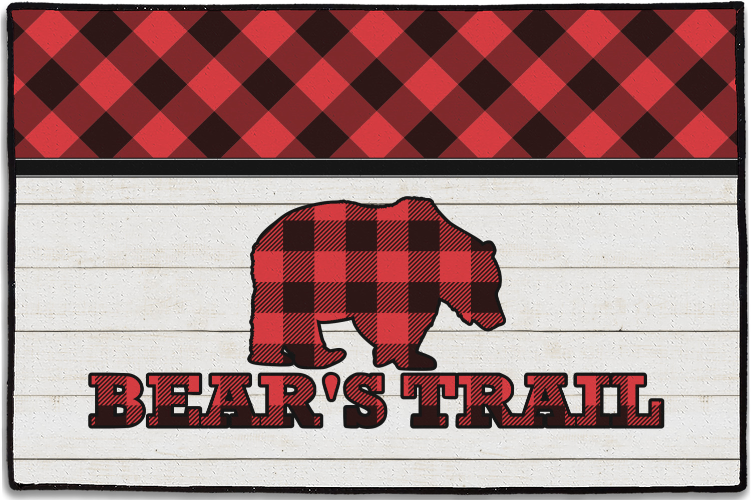 The main design is split into two asymmetrical sections. The top section is a diagonal red and black plaid, while the bottom is a light wood texture. On top of the wood texture is where your graphic and personalization go! The bear graphic and text below are filled with another black and red plaid.