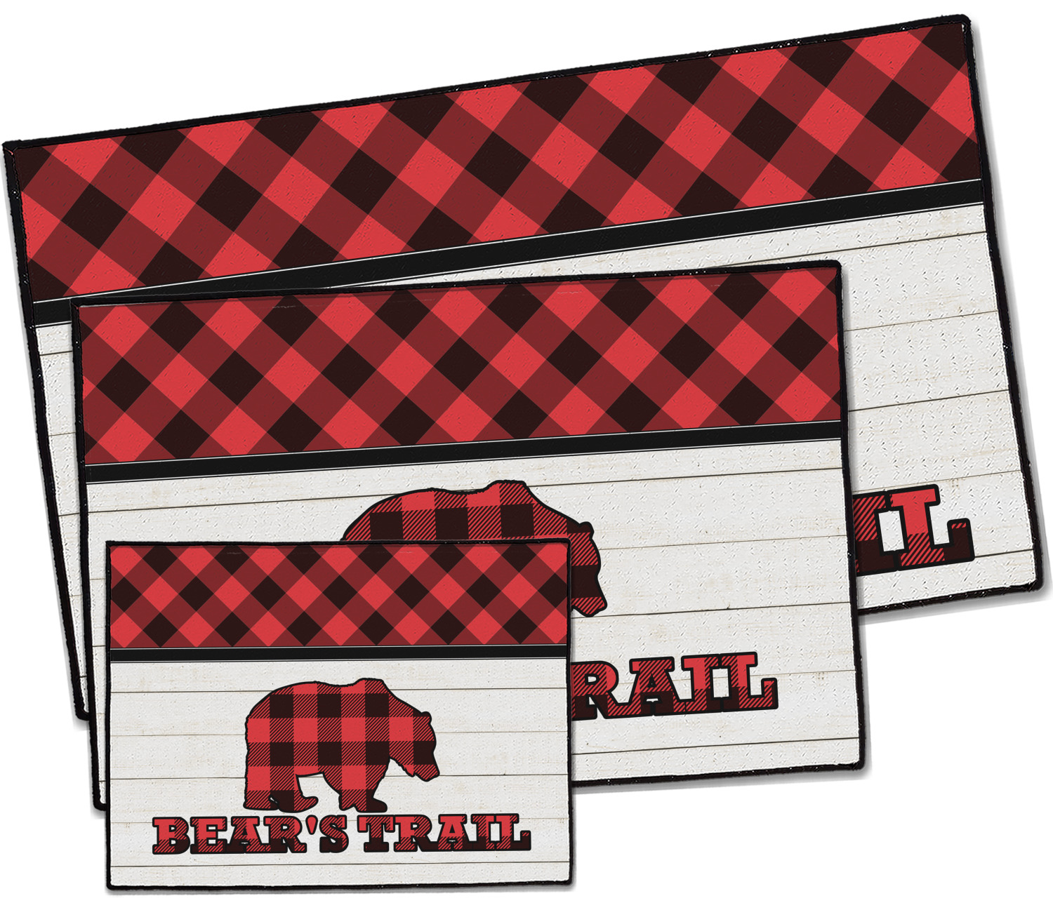 The main design is split into two asymmetrical sections. The top section is a diagonal red and black plaid, while the bottom is a light wood texture. On top of the wood texture is where your graphic and personalization go! The bear graphic and text below are filled with another black and red plaid.