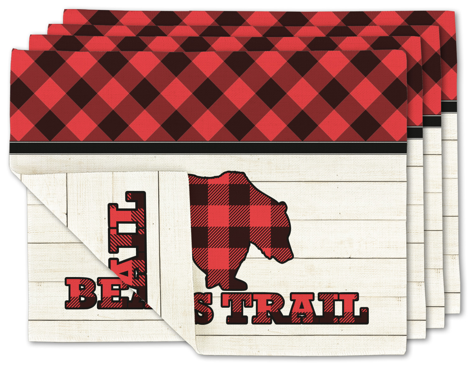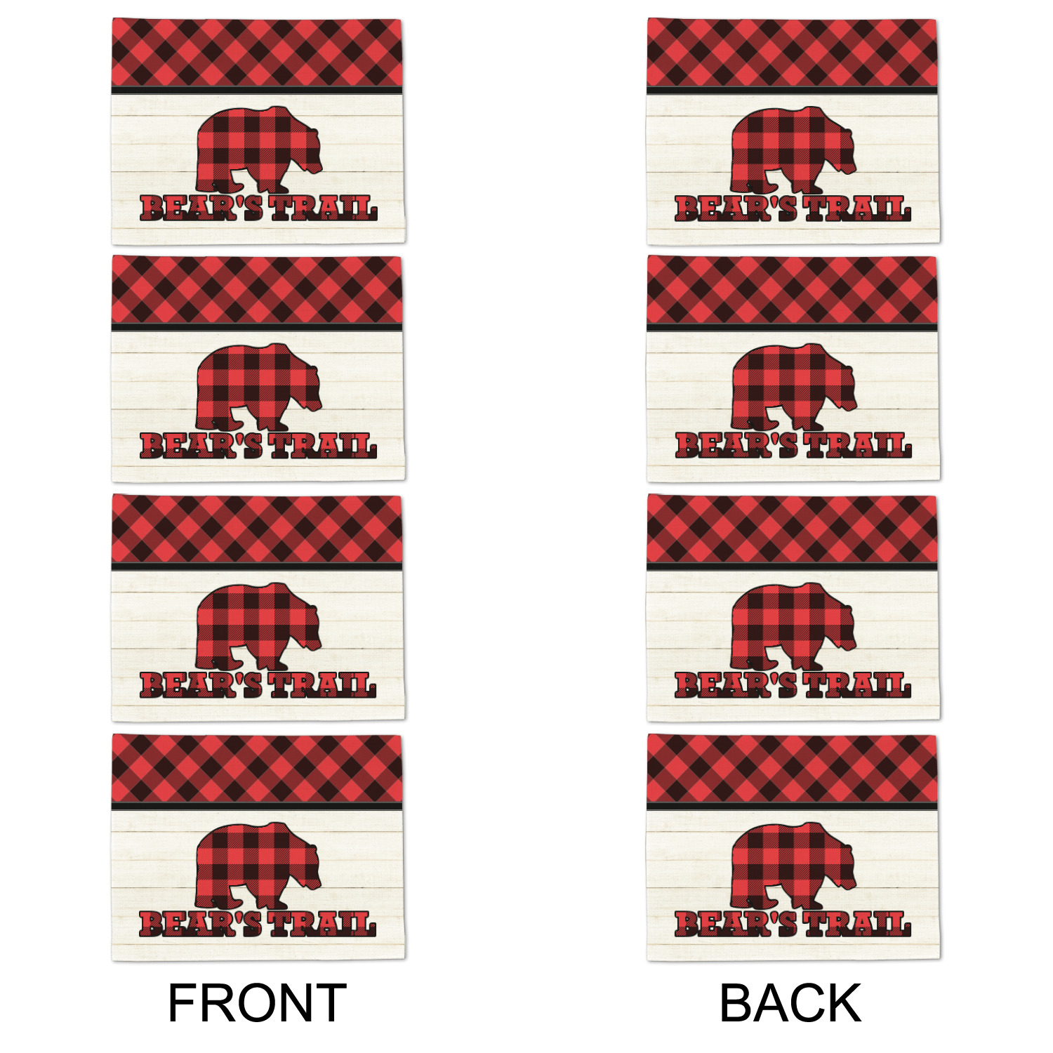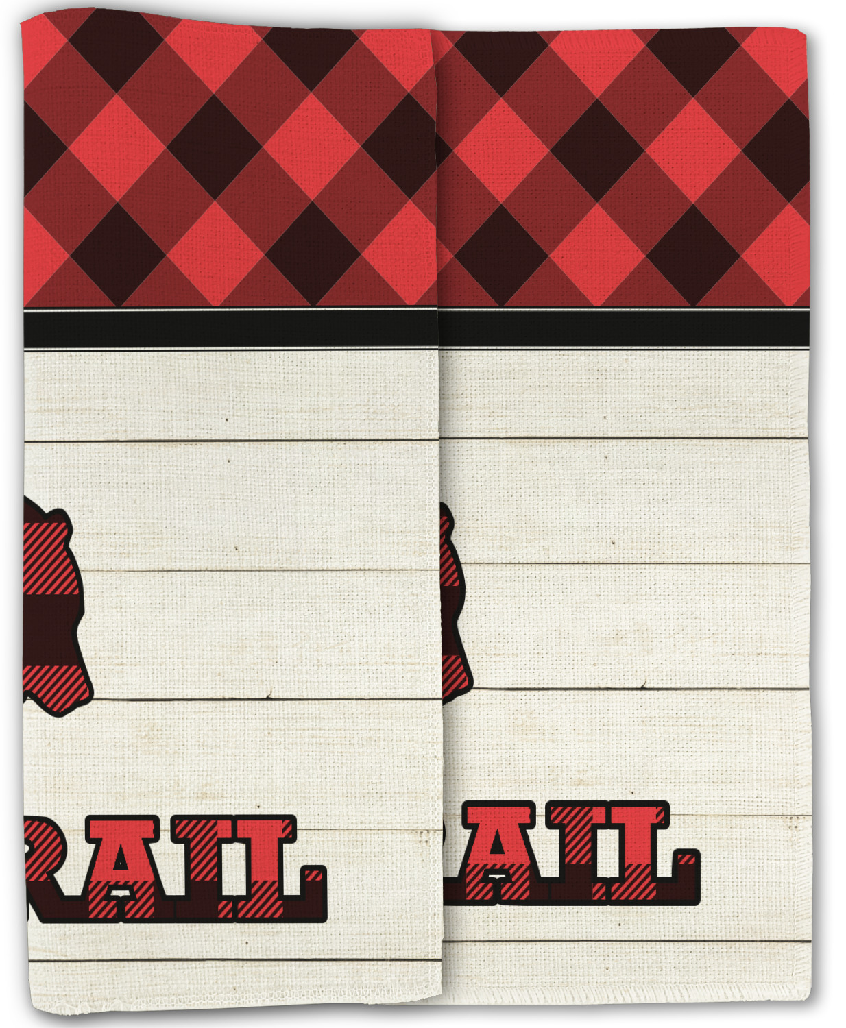 The main design is split into two asymmetrical sections. The top section is a diagonal red and black plaid, while the bottom is a light wood texture. On top of the wood texture is where your graphic and personalization go! The bear graphic and text below are filled with another black and red plaid.