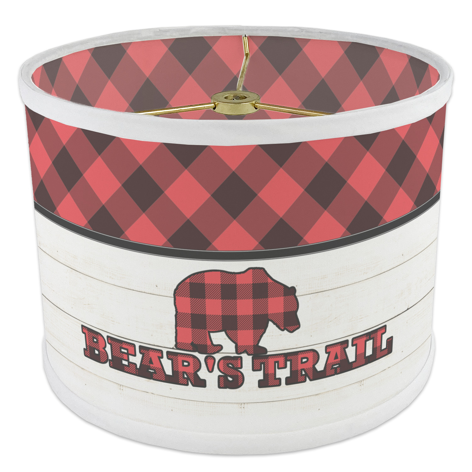 The main design is split into two asymmetrical sections. The top section is a diagonal red and black plaid, while the bottom is a light wood texture. On top of the wood texture is where your graphic and personalization go! The bear graphic and text below are filled with another black and red plaid.
