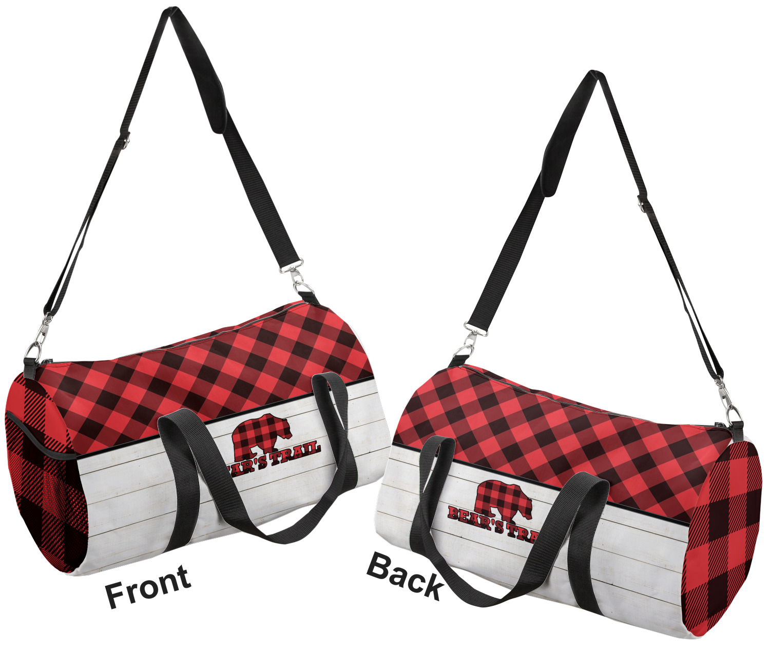 The main design is split into two asymmetrical sections. The top section is a diagonal red and black plaid, while the bottom is a light wood texture. On top of the wood texture is where your graphic and personalization go! The bear graphic and text below are filled with another black and red plaid.