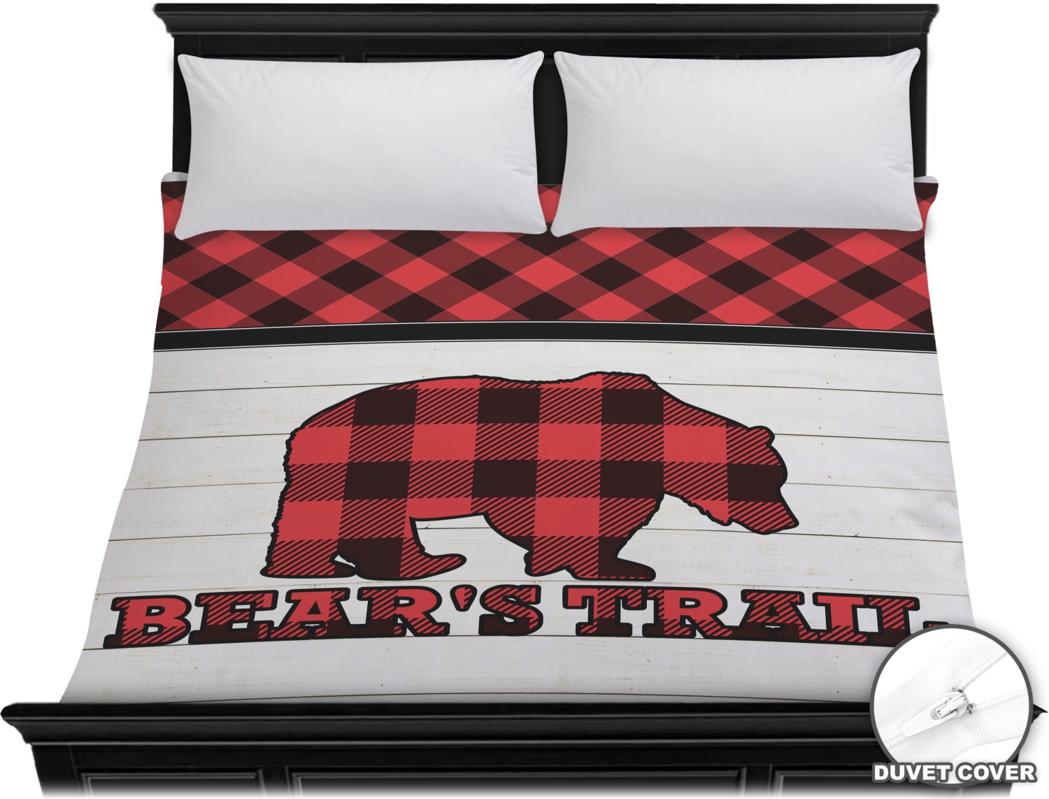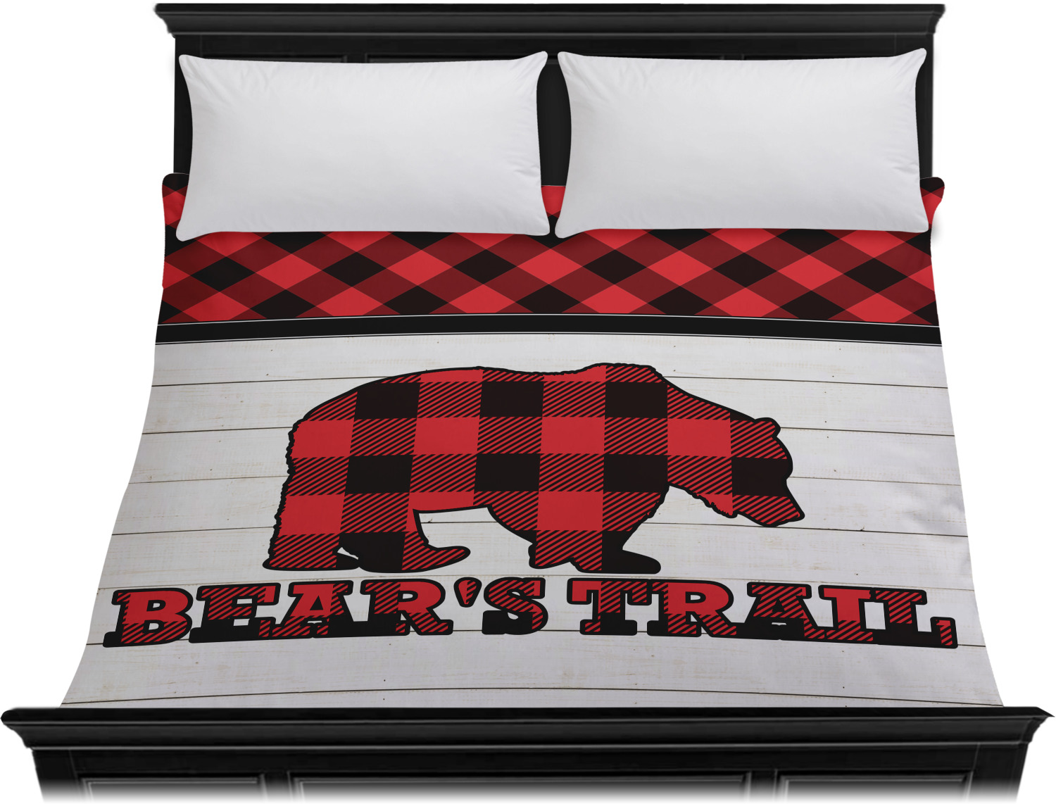 The main design is split into two asymmetrical sections. The top section is a diagonal red and black plaid, while the bottom is a light wood texture. On top of the wood texture is where your graphic and personalization go! The bear graphic and text below are filled with another black and red plaid.
