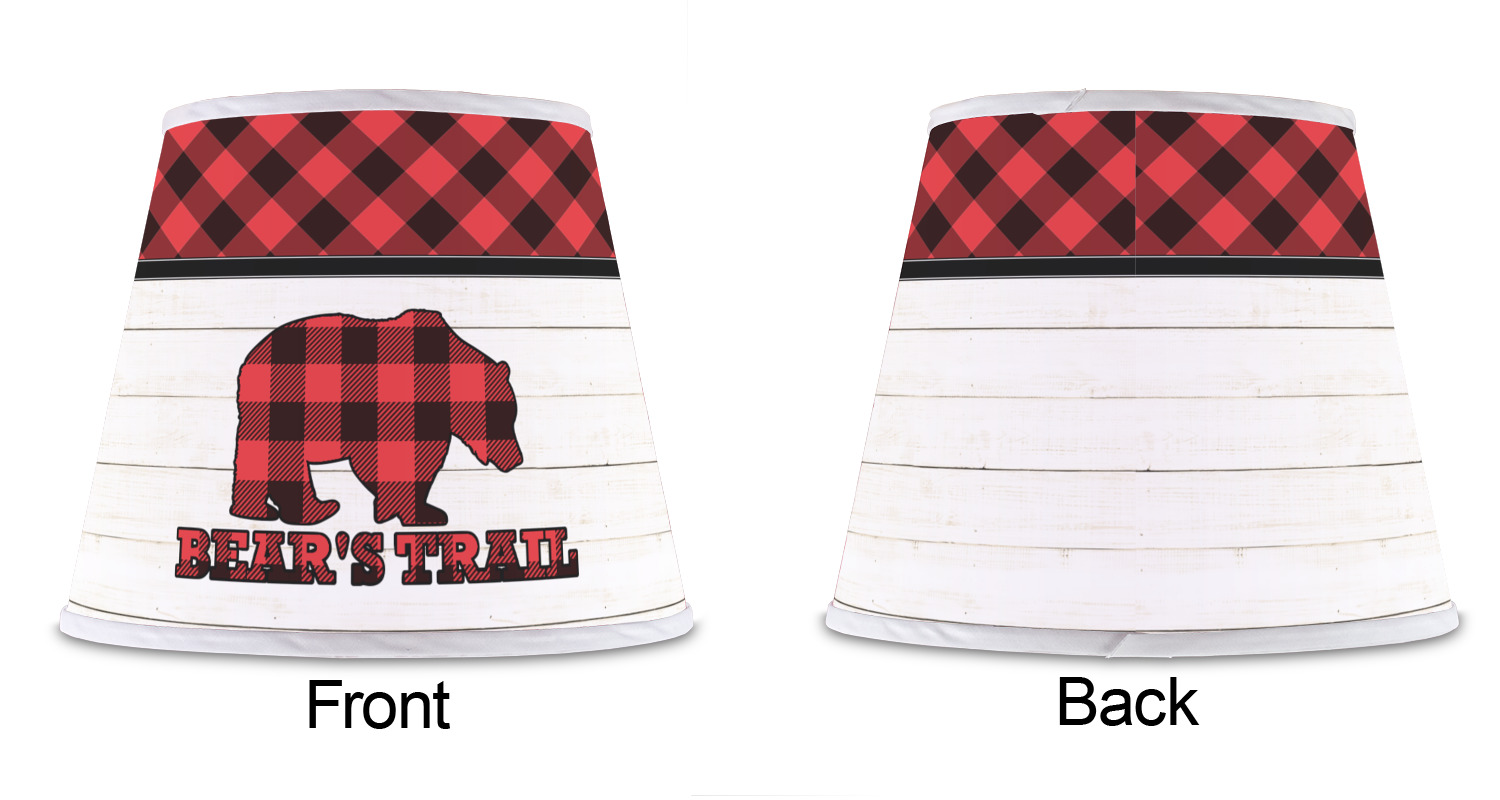 The main design is split into two asymmetrical sections. The top section is a diagonal red and black plaid, while the bottom is a light wood texture. On top of the wood texture is where your graphic and personalization go! The bear graphic and text below are filled with another black and red plaid.