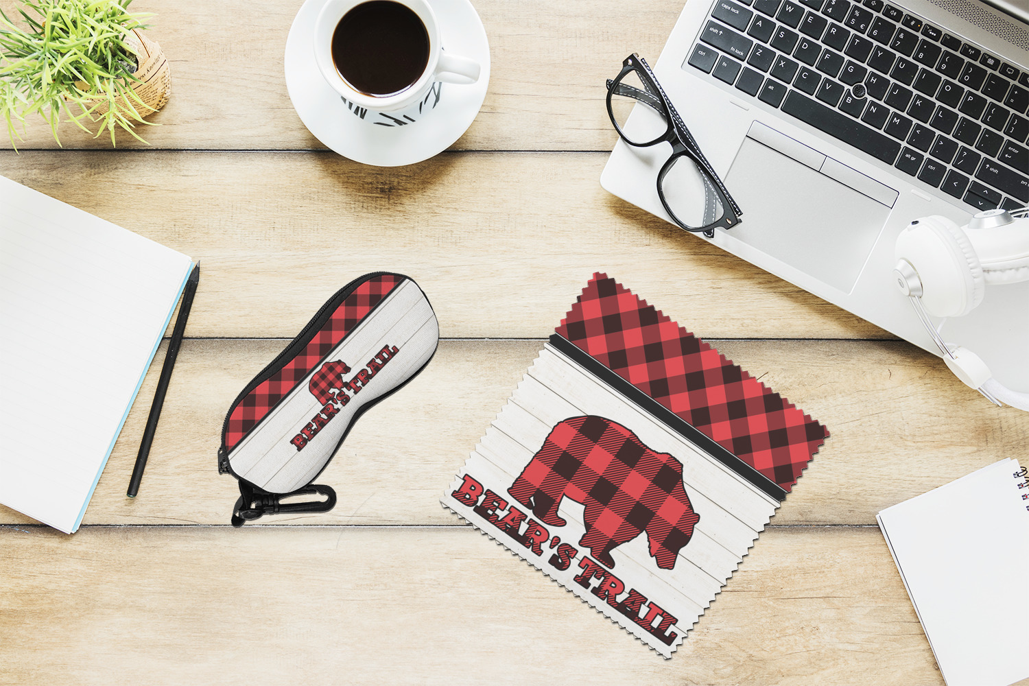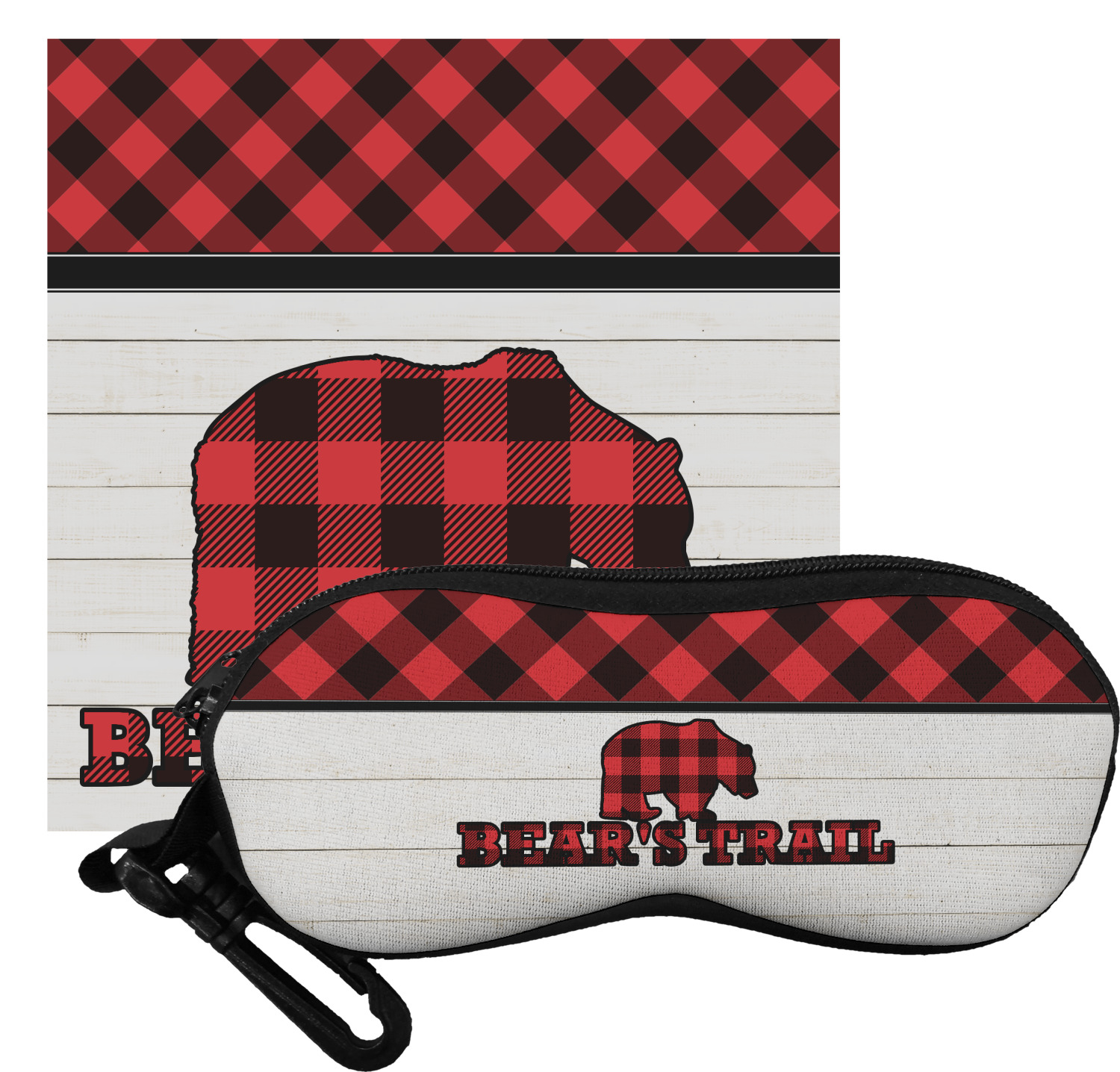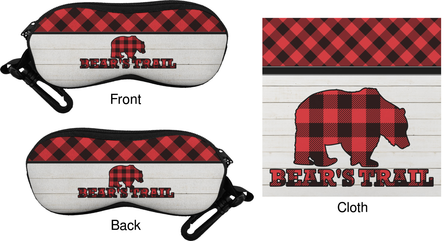 The main design is split into two asymmetrical sections. The top section is a diagonal red and black plaid, while the bottom is a light wood texture. On top of the wood texture is where your graphic and personalization go! The bear graphic and text below are filled with another black and red plaid.