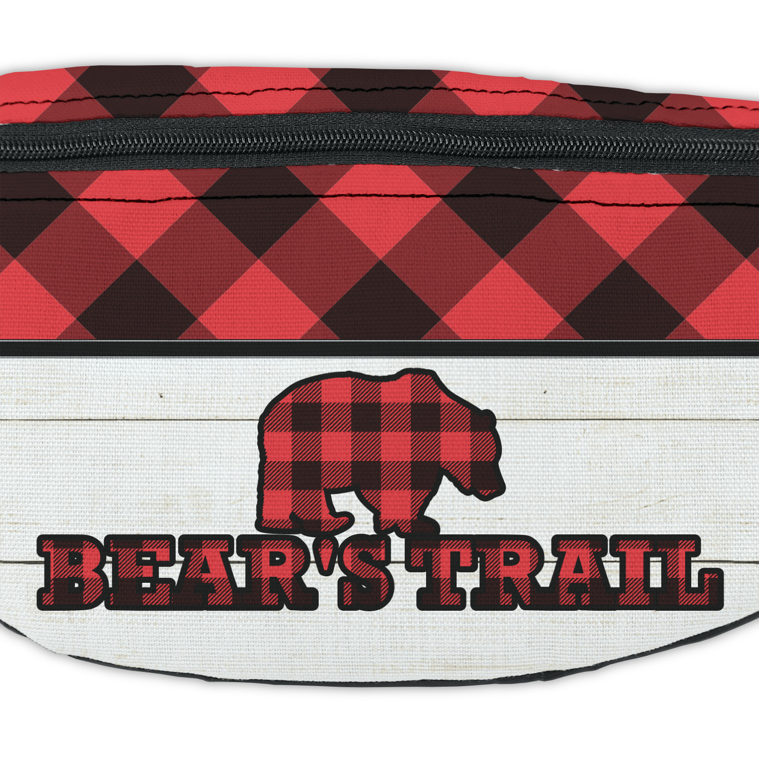 The main design is split into two asymmetrical sections. The top section is a diagonal red and black plaid, while the bottom is a light wood texture. On top of the wood texture is where your graphic and personalization go! The bear graphic and text below are filled with another black and red plaid.