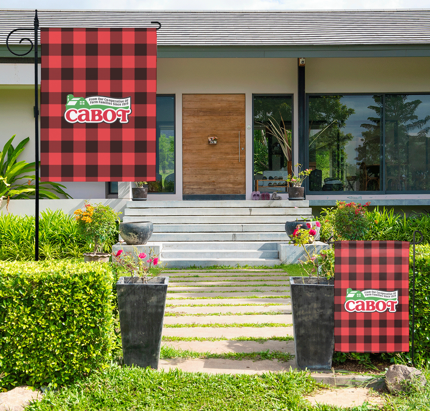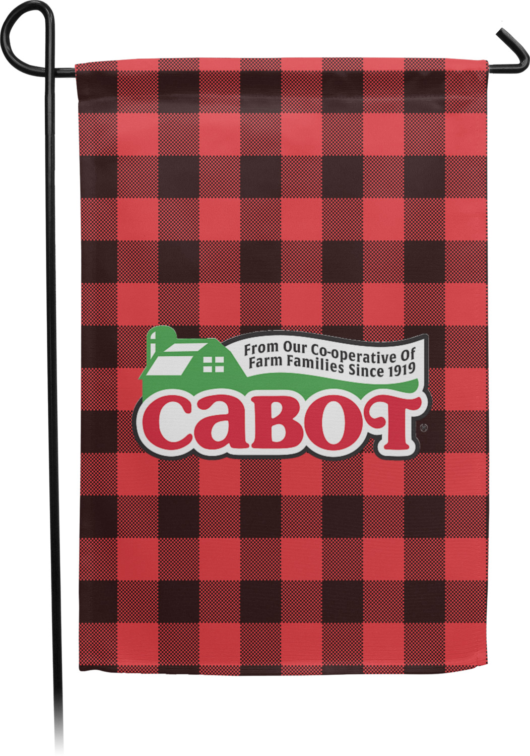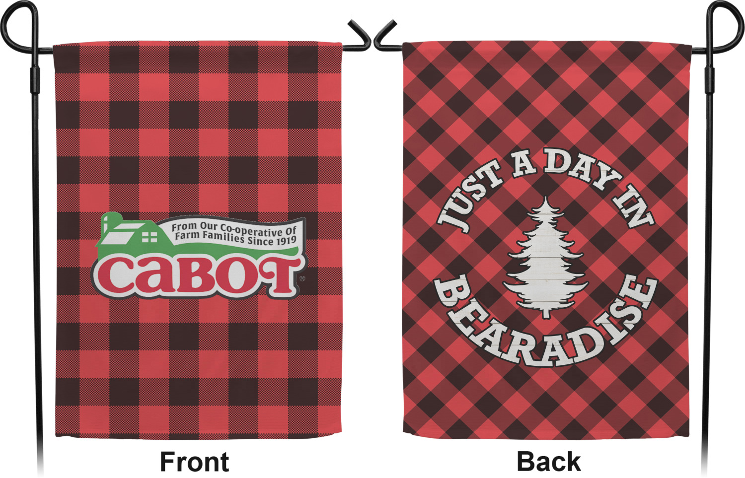 These custom garden flags are made of a durable, double-ply, polyester weave, allowing them to withstand the elements year round. The small flags measure at approximately 12 by 18 inches. The large flags measure out to 28 by 37 inches. You can order these decorative flags with your customization printed on the front only, or the front and back.