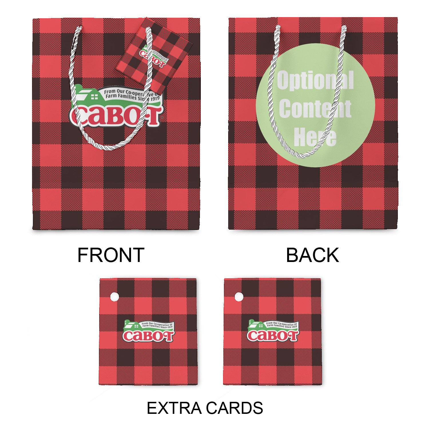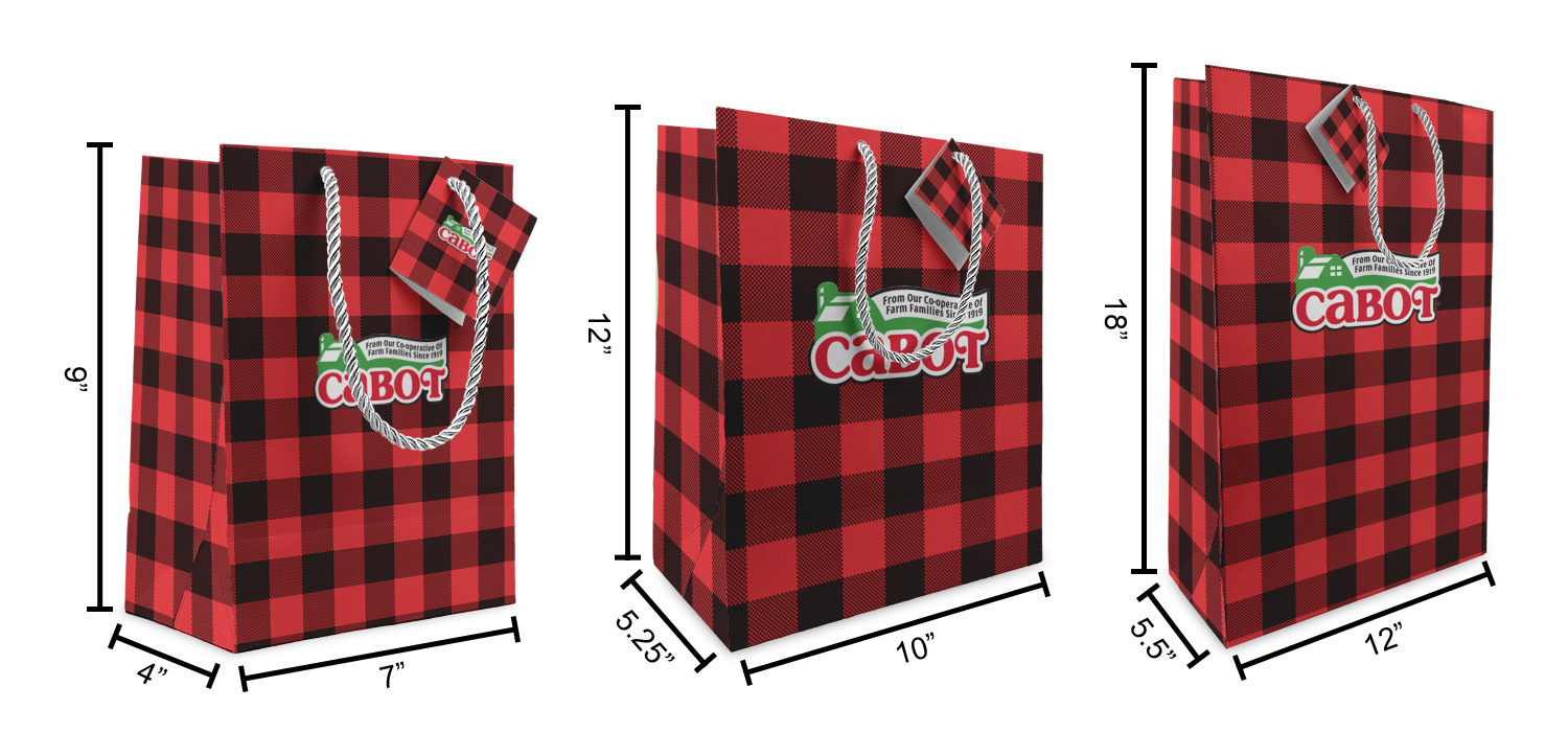 | Size (Varies By Option) | Small Gift Bag (7" x 4" x 9") Medium Gift Bag (10" x 5.25" x 12") Large Gift Bag (12" x 5.5" x 18") |