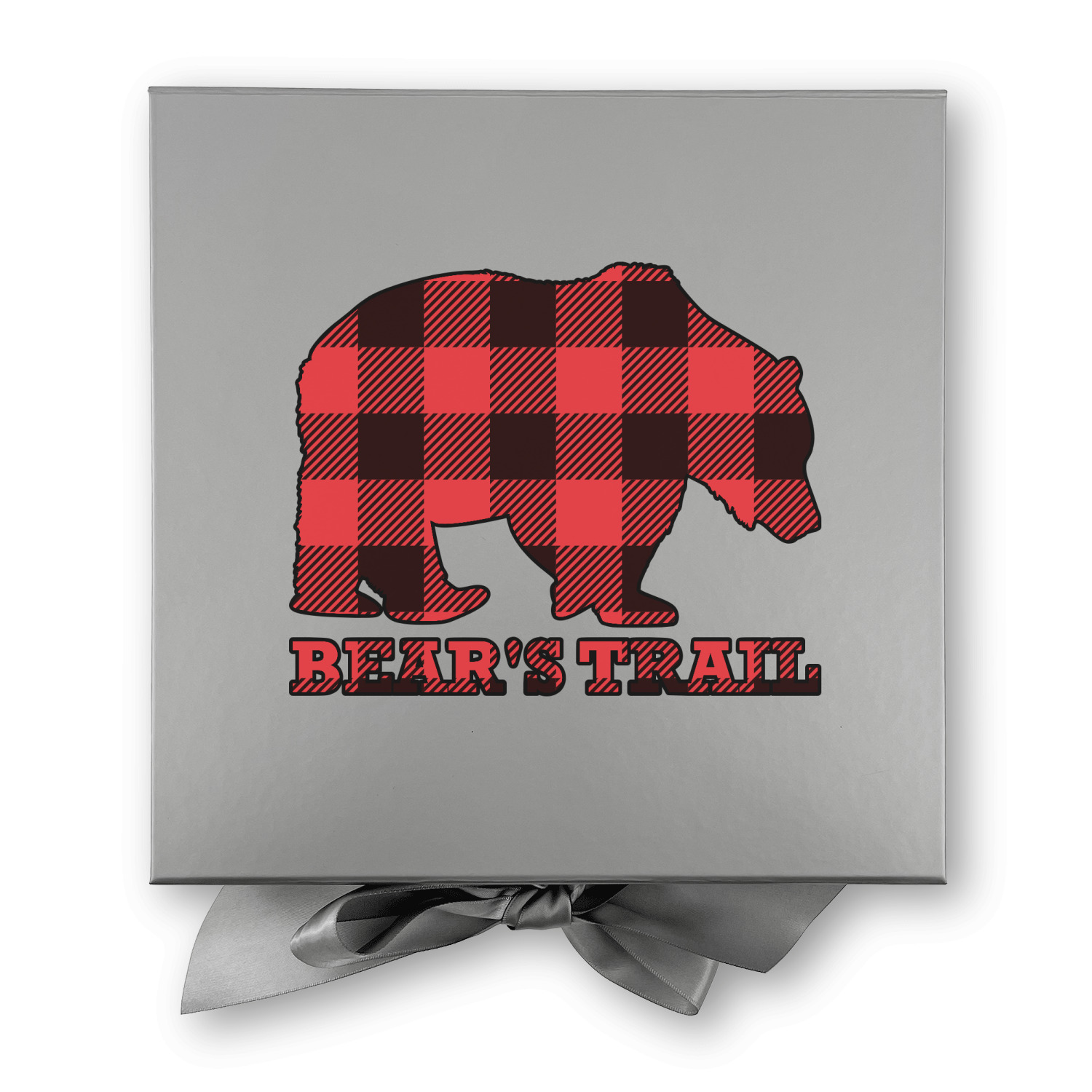 The main design is split into two asymmetrical sections. The top section is a diagonal red and black plaid, while the bottom is a light wood texture. On top of the wood texture is where your graphic and personalization go! The bear graphic and text below are filled with another black and red plaid.