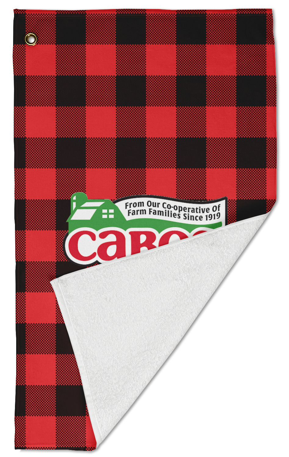 The towel is fully printed / patterned on the front polyester side; and is white on terrycloth cotton backside. The towel has grommet and a pear spring clip in the top left corner. Our golf towels are available in 100s of different prints and patterns.