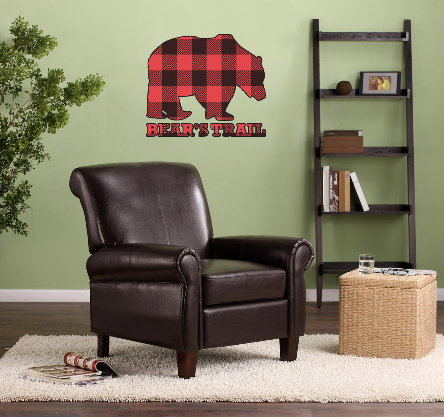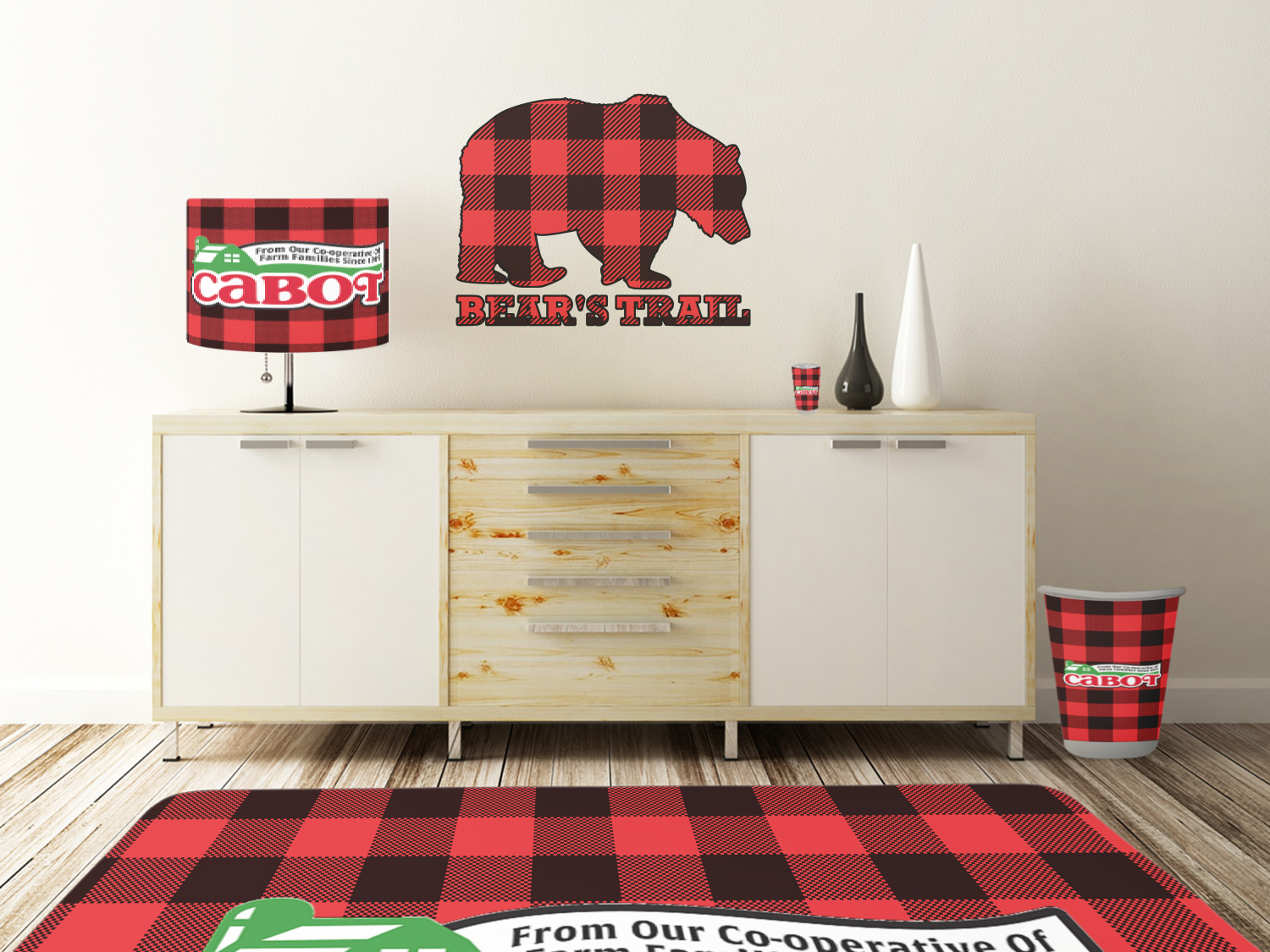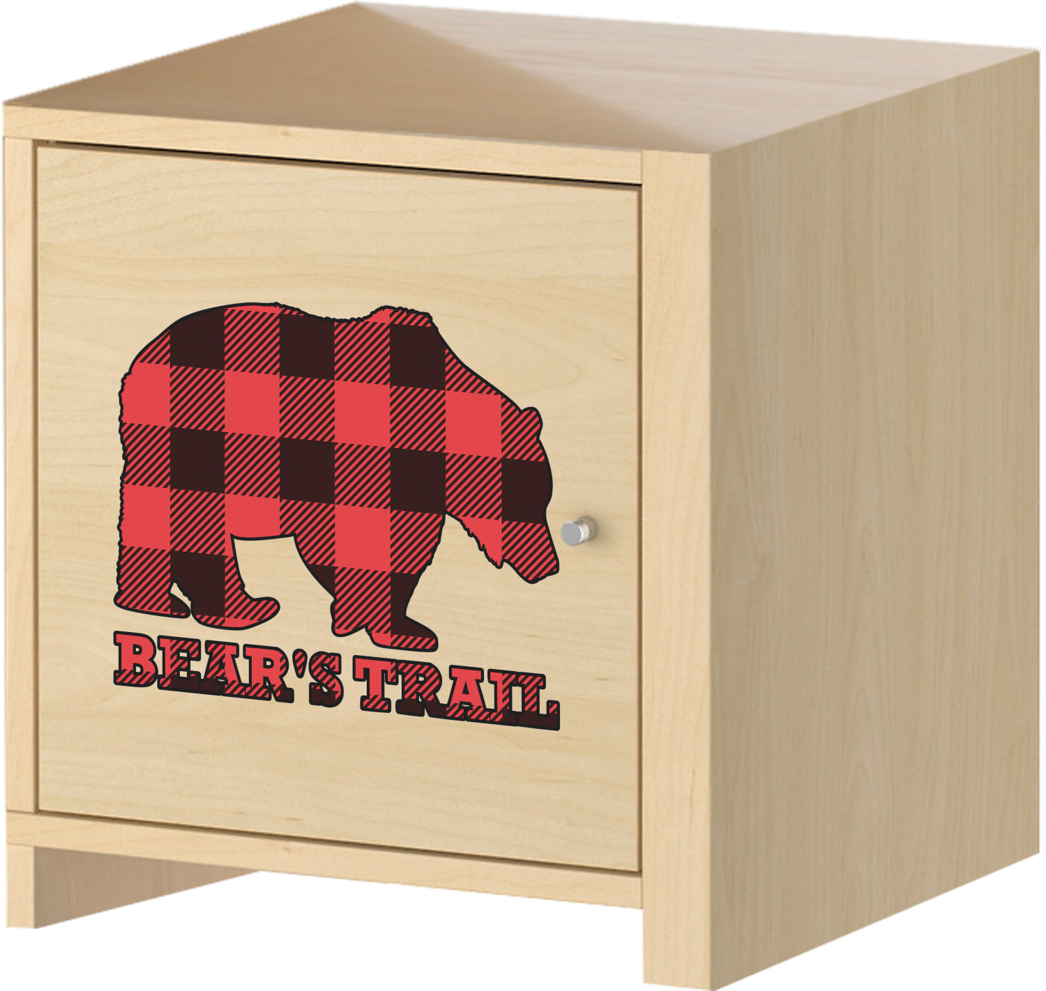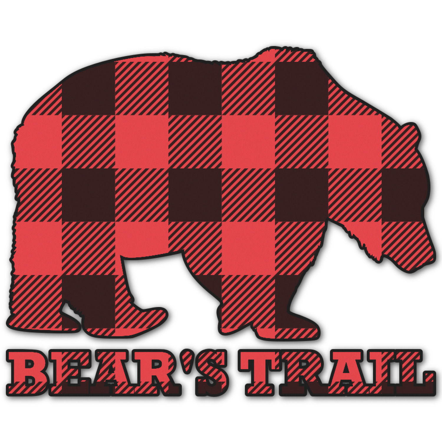 The main design is split into two asymmetrical sections. The top section is a diagonal red and black plaid, while the bottom is a light wood texture. On top of the wood texture is where your graphic and personalization go! The bear graphic and text below are filled with another black and red plaid.