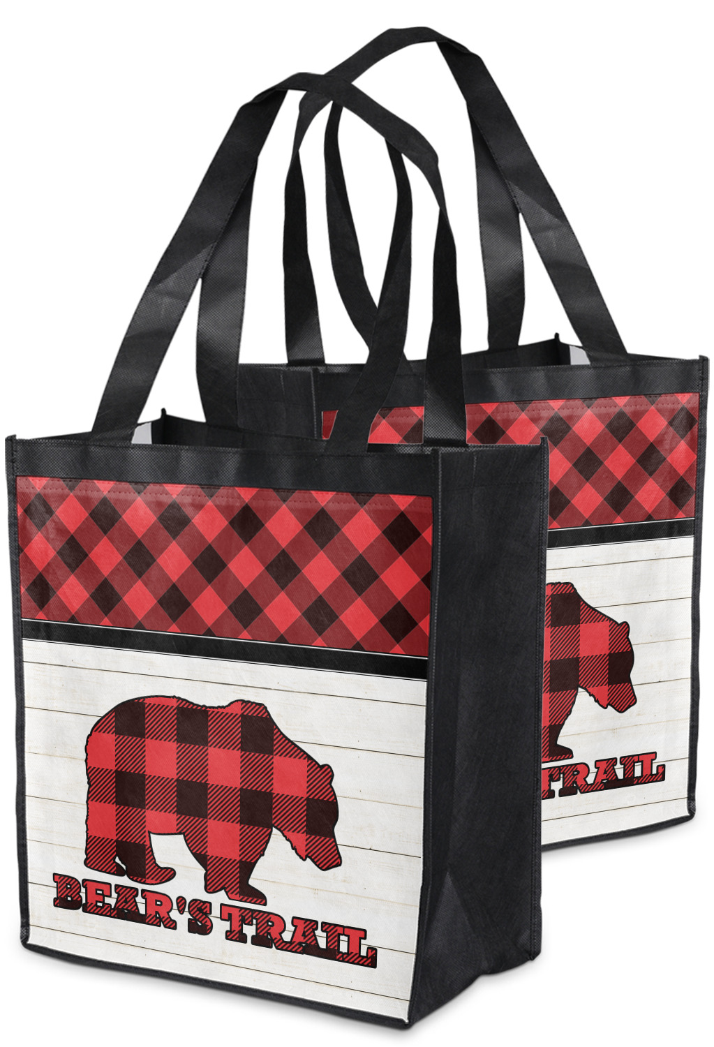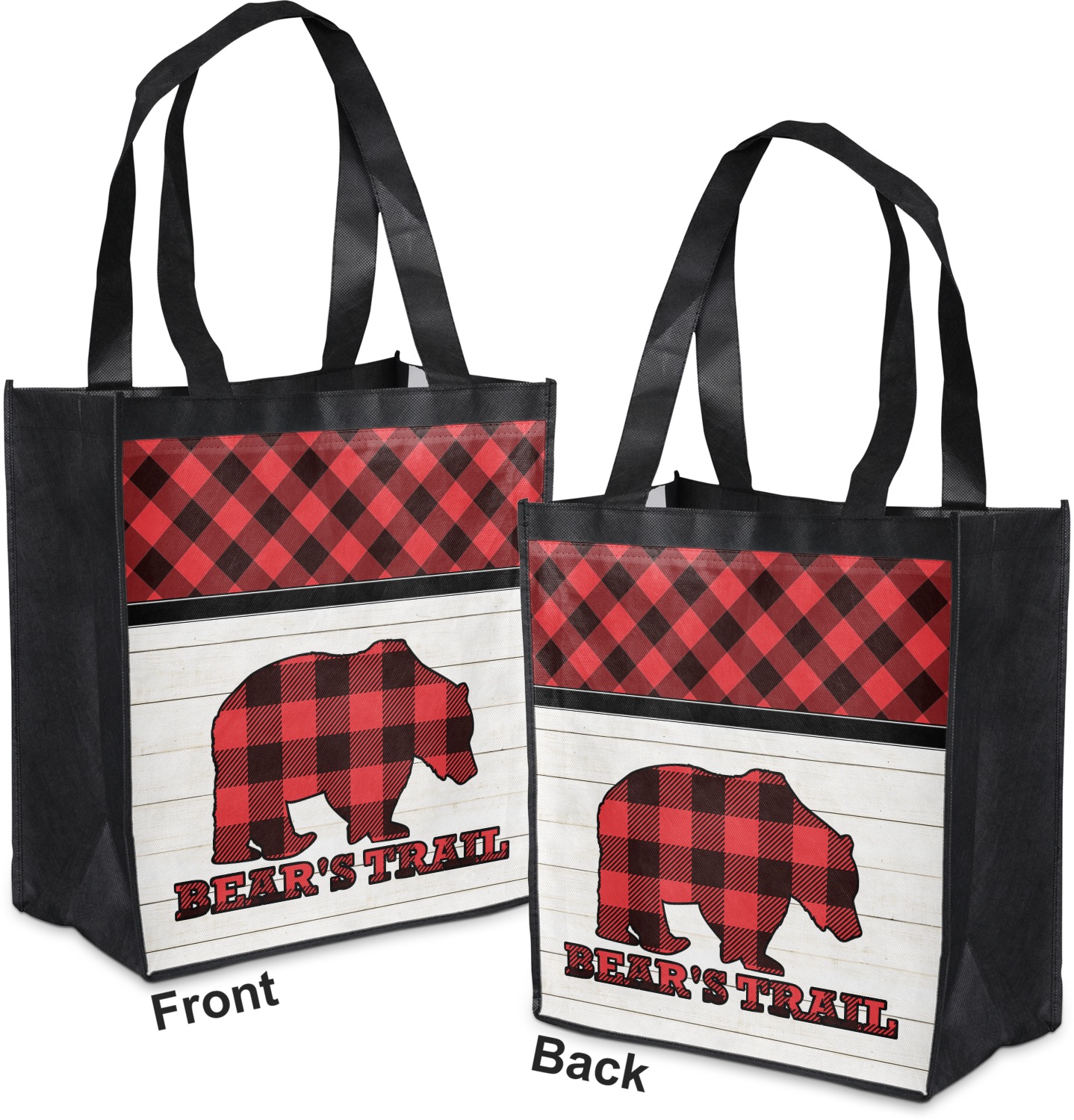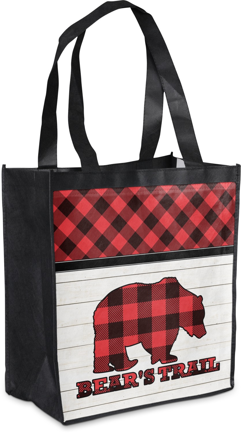 The main design is split into two asymmetrical sections. The top section is a diagonal red and black plaid, while the bottom is a light wood texture. On top of the wood texture is where your graphic and personalization go! The bear graphic and text below are filled with another black and red plaid.