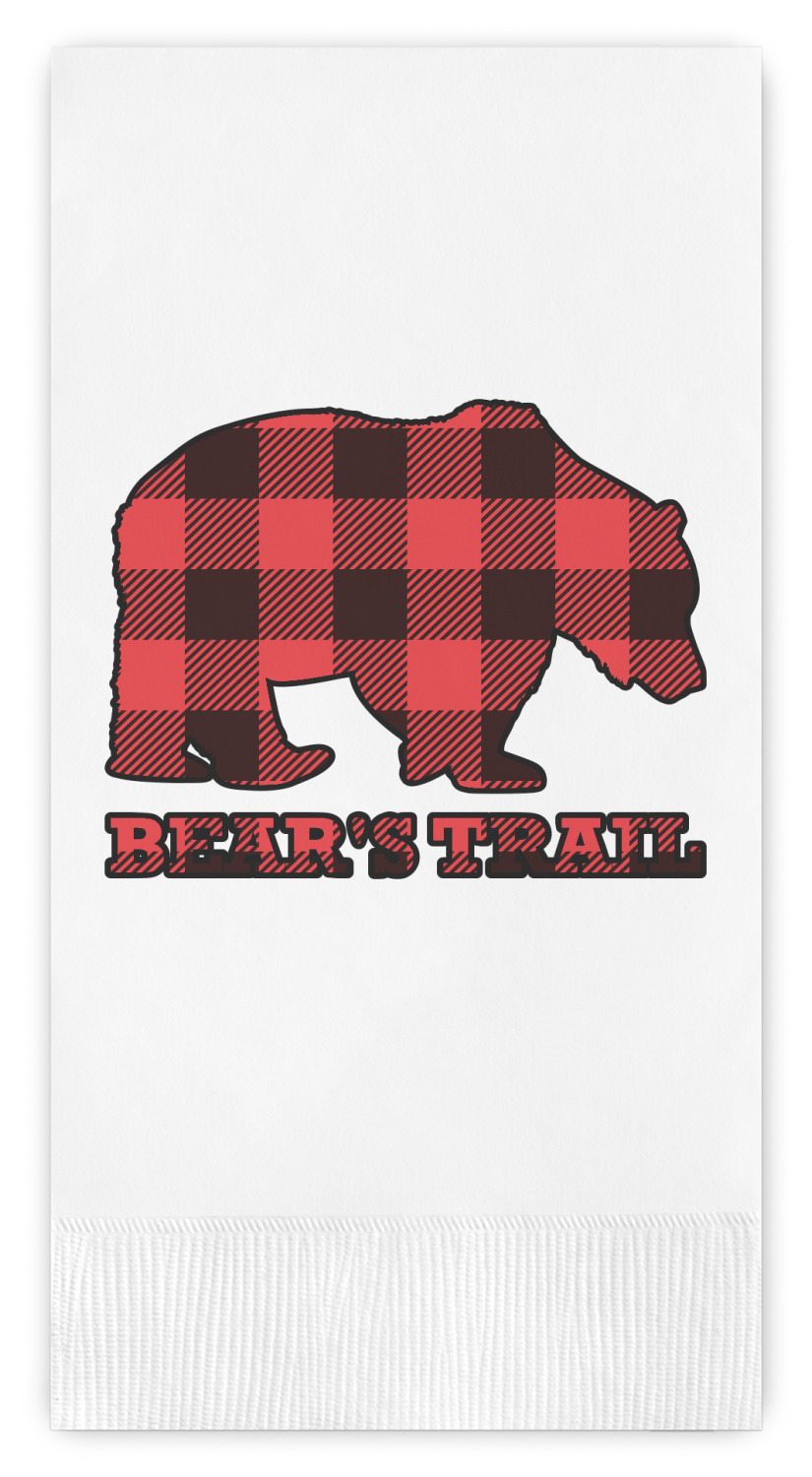 The main design is split into two asymmetrical sections. The top section is a diagonal red and black plaid, while the bottom is a light wood texture. On top of the wood texture is where your graphic and personalization go! The bear graphic and text below are filled with another black and red plaid.