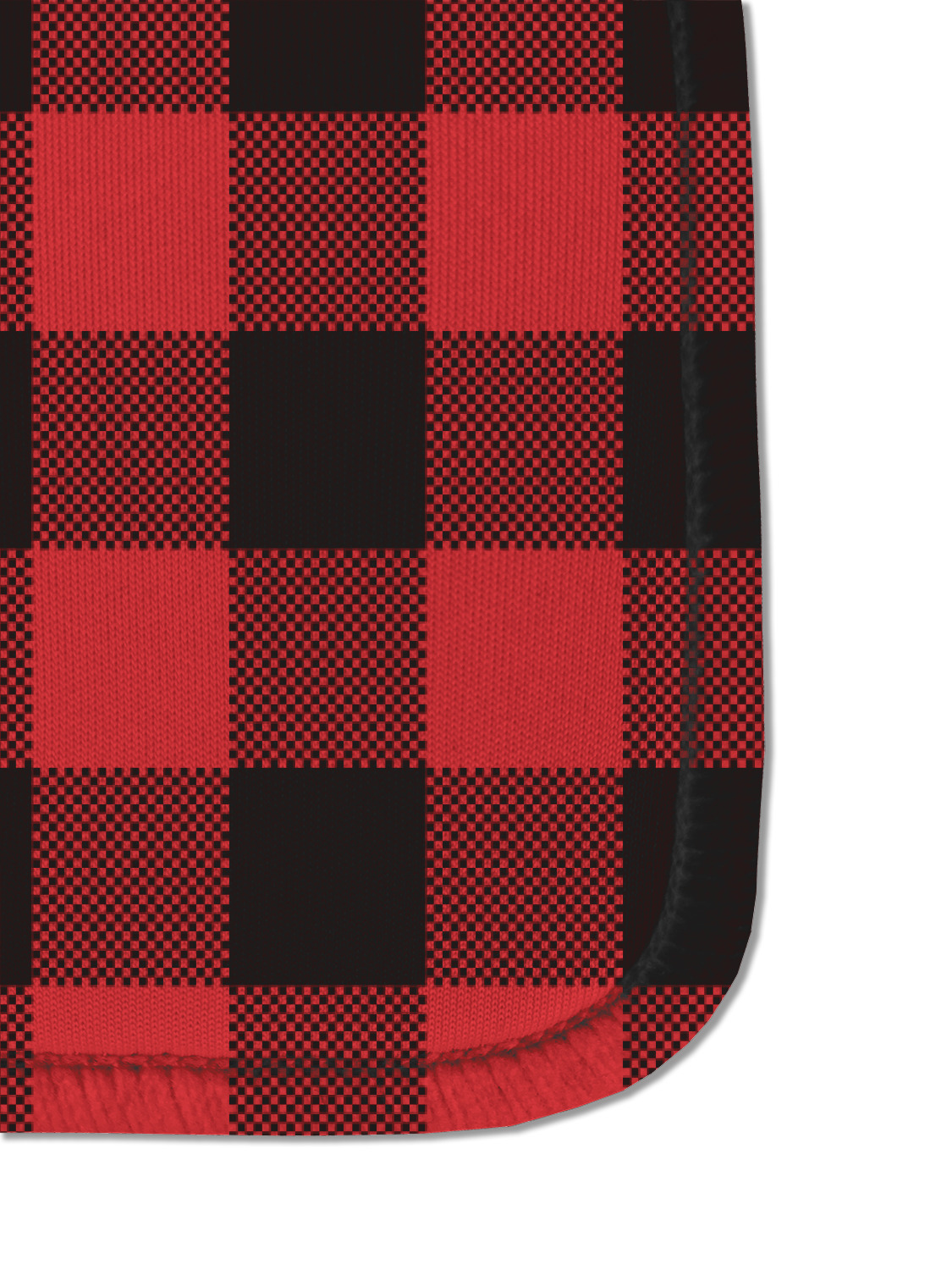 The main design is split into two asymmetrical sections. The top section is a diagonal red and black plaid, while the bottom is a light wood texture. On top of the wood texture is where your graphic and personalization go! The bear graphic and text below are filled with another black and red plaid.