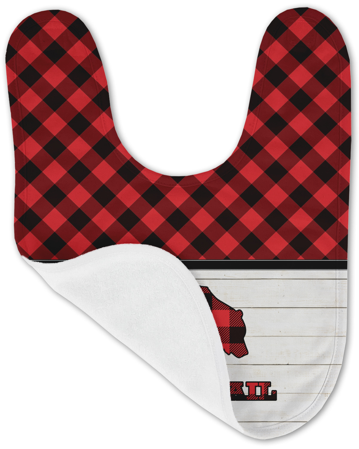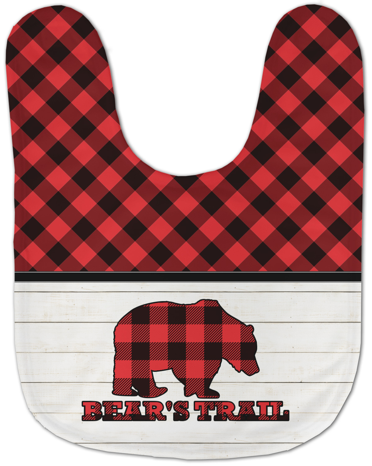 The main design is split into two asymmetrical sections. The top section is a diagonal red and black plaid, while the bottom is a light wood texture. On top of the wood texture is where your graphic and personalization go! The bear graphic and text below are filled with another black and red plaid.