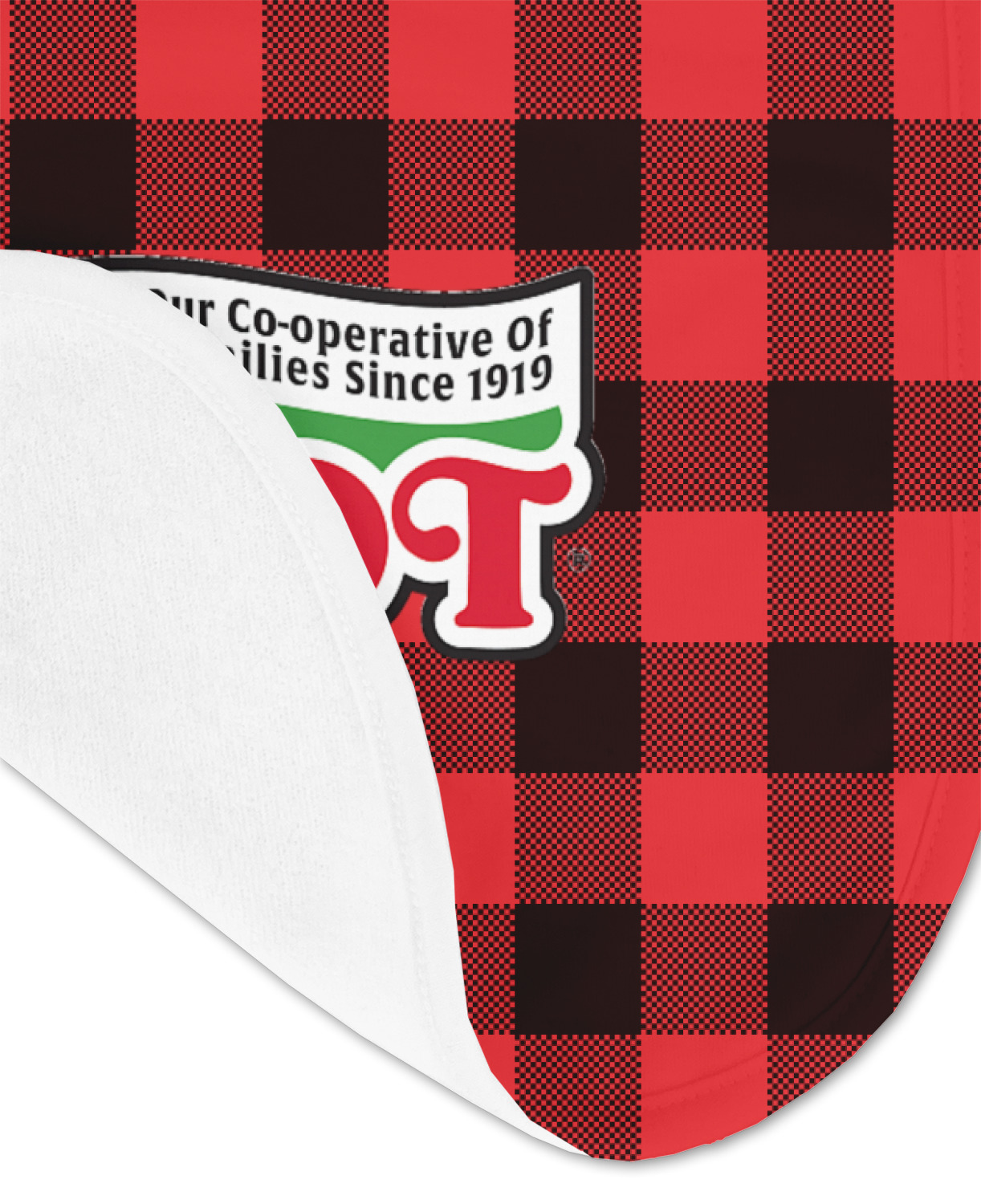 The main design is split into two asymmetrical sections. The top section is a diagonal red and black plaid, while the bottom is a light wood texture. On top of the wood texture is where your graphic and personalization go! The bear graphic and text below are filled with another black and red plaid.