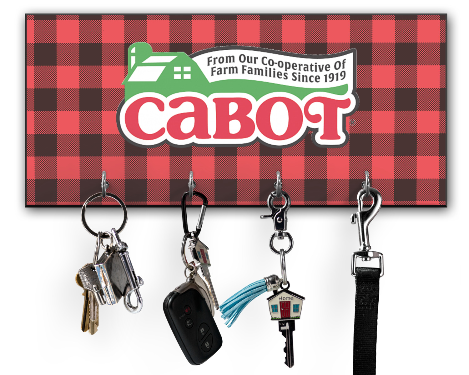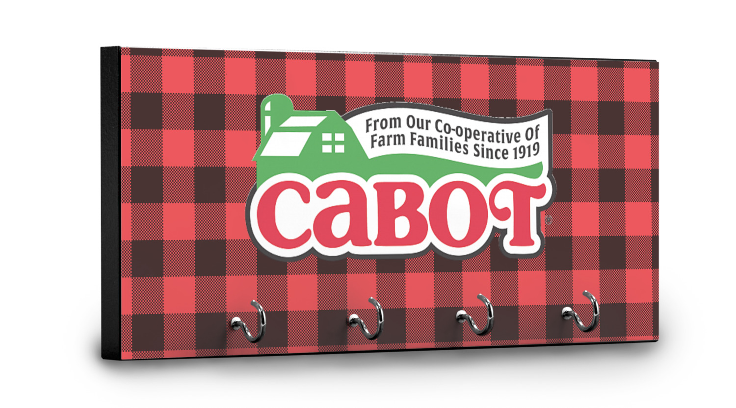 This 11" x 5" key hanger is made of sturdy wood and has four metal hooks lining the bottom. This is the perfect size for a family with several drivers. Not only can you hang keys on it though, but pet leashes and other small items. The board is black on the sides and back and is printed with the design of your choice on the front.