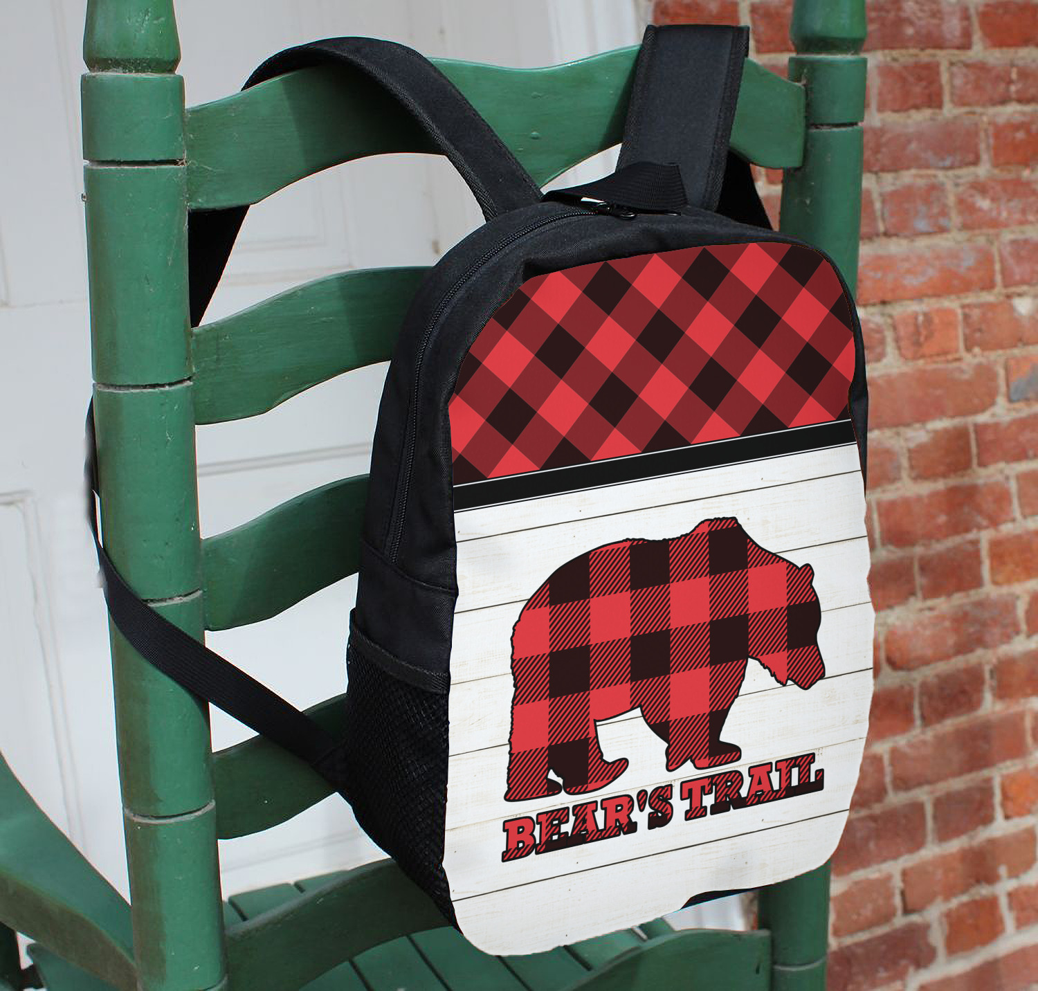 The main design is split into two asymmetrical sections. The top section is a diagonal red and black plaid, while the bottom is a light wood texture. On top of the wood texture is where your graphic and personalization go! The bear graphic and text below are filled with another black and red plaid.
