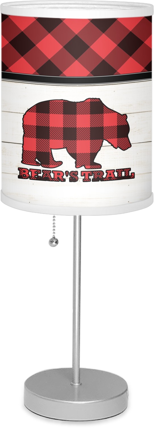 The main design is split into two asymmetrical sections. The top section is a diagonal red and black plaid, while the bottom is a light wood texture. On top of the wood texture is where your graphic and personalization go! The bear graphic and text below are filled with another black and red plaid.