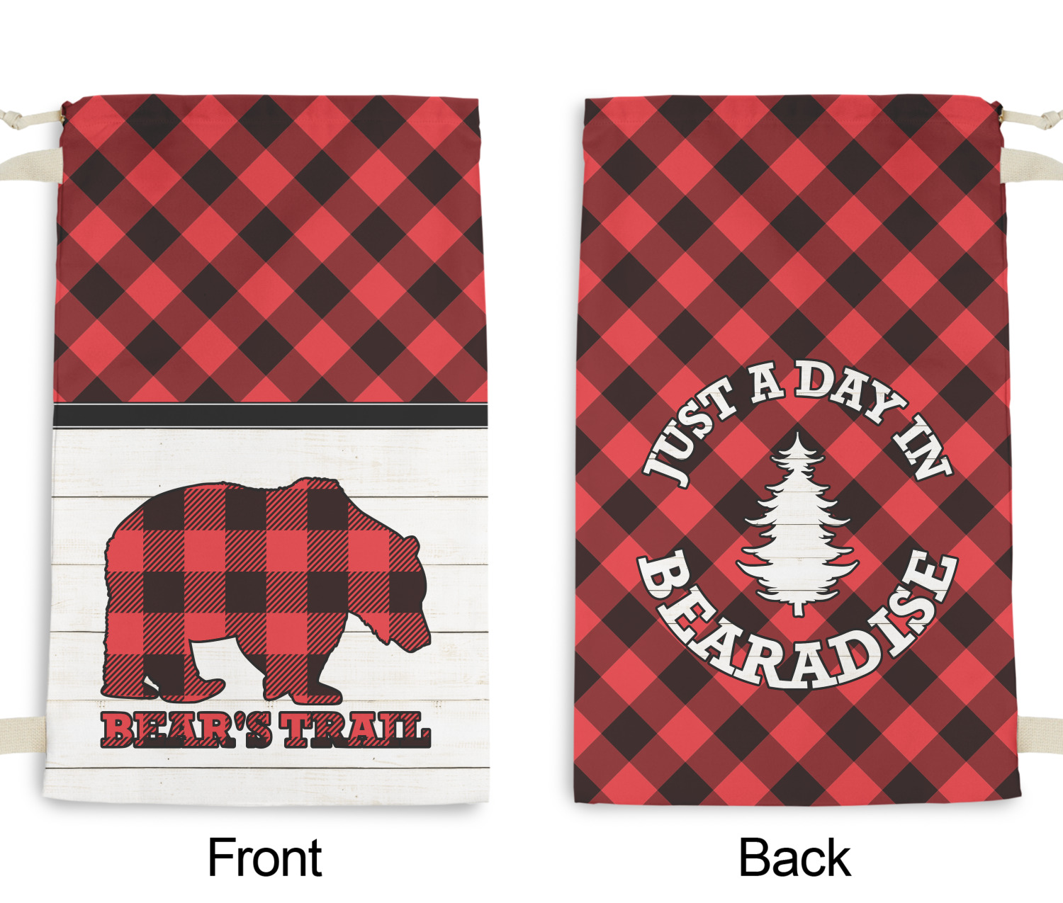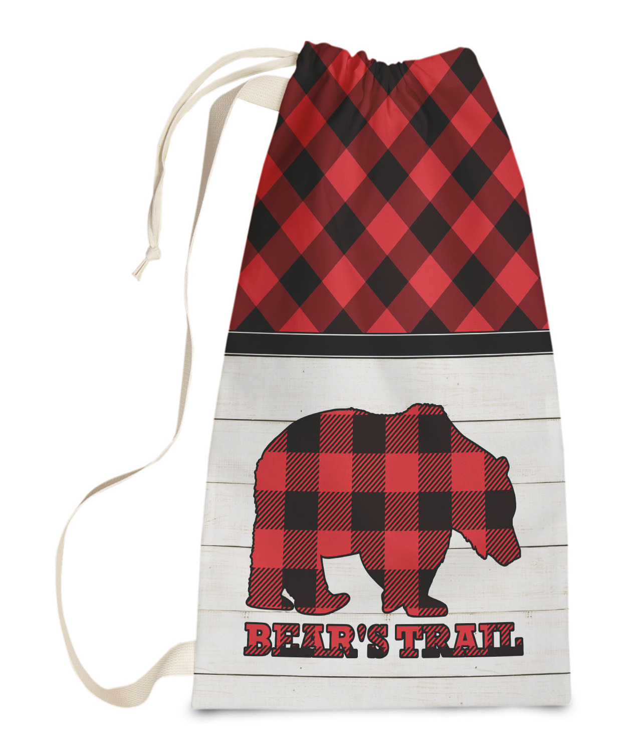 The main design is split into two asymmetrical sections. The top section is a diagonal red and black plaid, while the bottom is a light wood texture. On top of the wood texture is where your graphic and personalization go! The bear graphic and text below are filled with another black and red plaid.