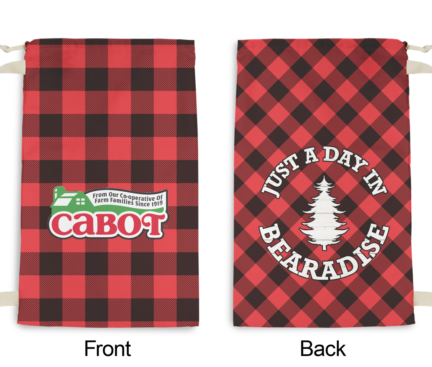 The main design is split into two asymmetrical sections. The top section is a diagonal red and black plaid, while the bottom is a light wood texture. On top of the wood texture is where your graphic and personalization go! The bear graphic and text below are filled with another black and red plaid.