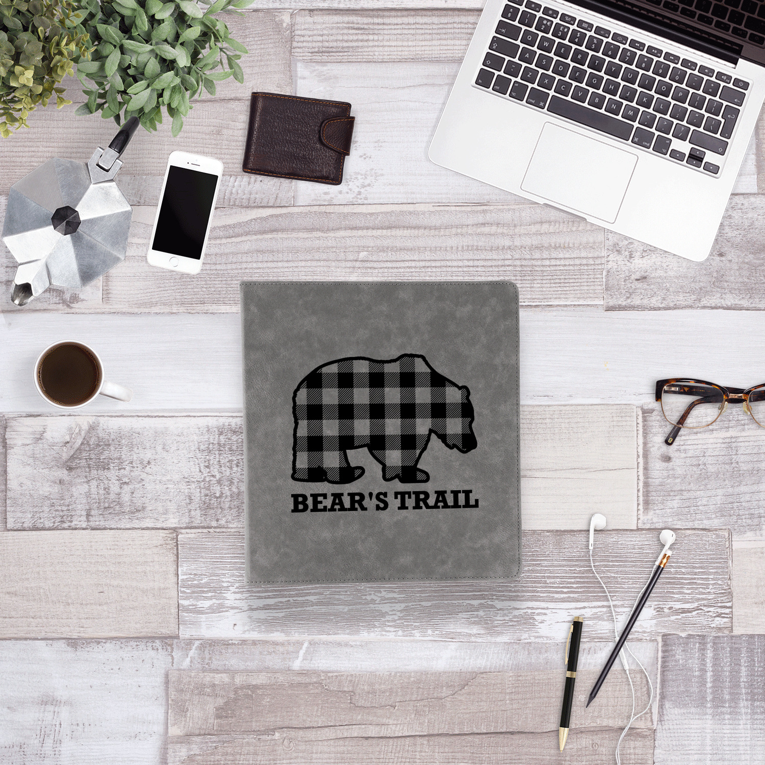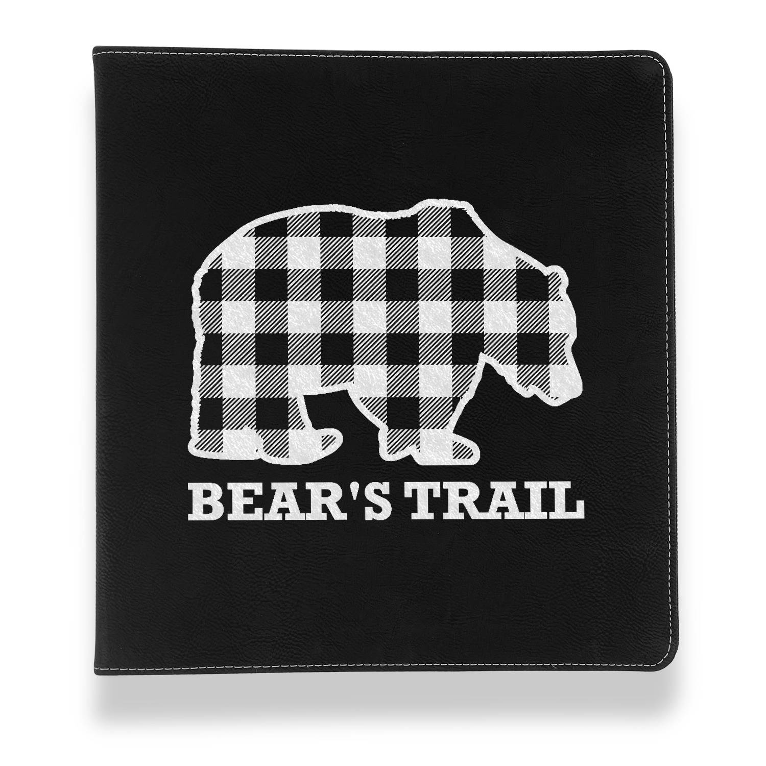 The main design is split into two asymmetrical sections. The top section is a diagonal red and black plaid, while the bottom is a light wood texture. On top of the wood texture is where your graphic and personalization go! The bear graphic and text below are filled with another black and red plaid.