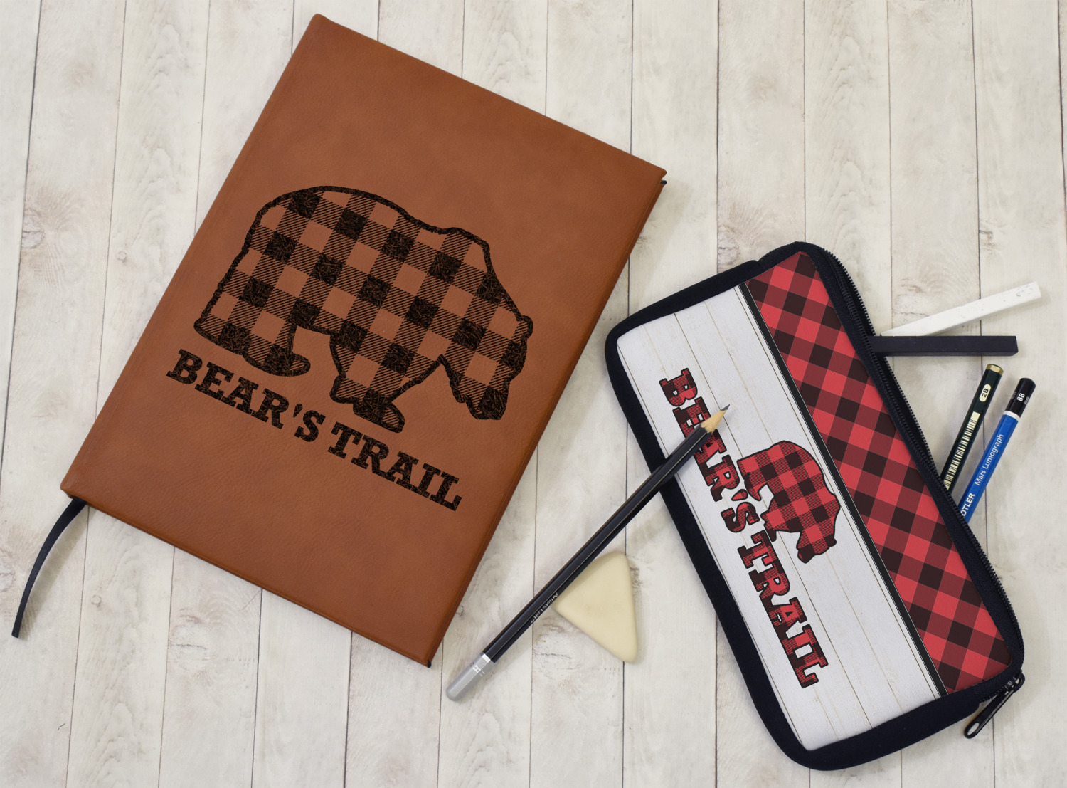 The main design is split into two asymmetrical sections. The top section is a diagonal red and black plaid, while the bottom is a light wood texture. On top of the wood texture is where your graphic and personalization go! The bear graphic and text below are filled with another black and red plaid.