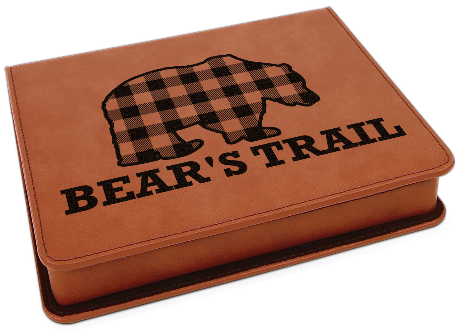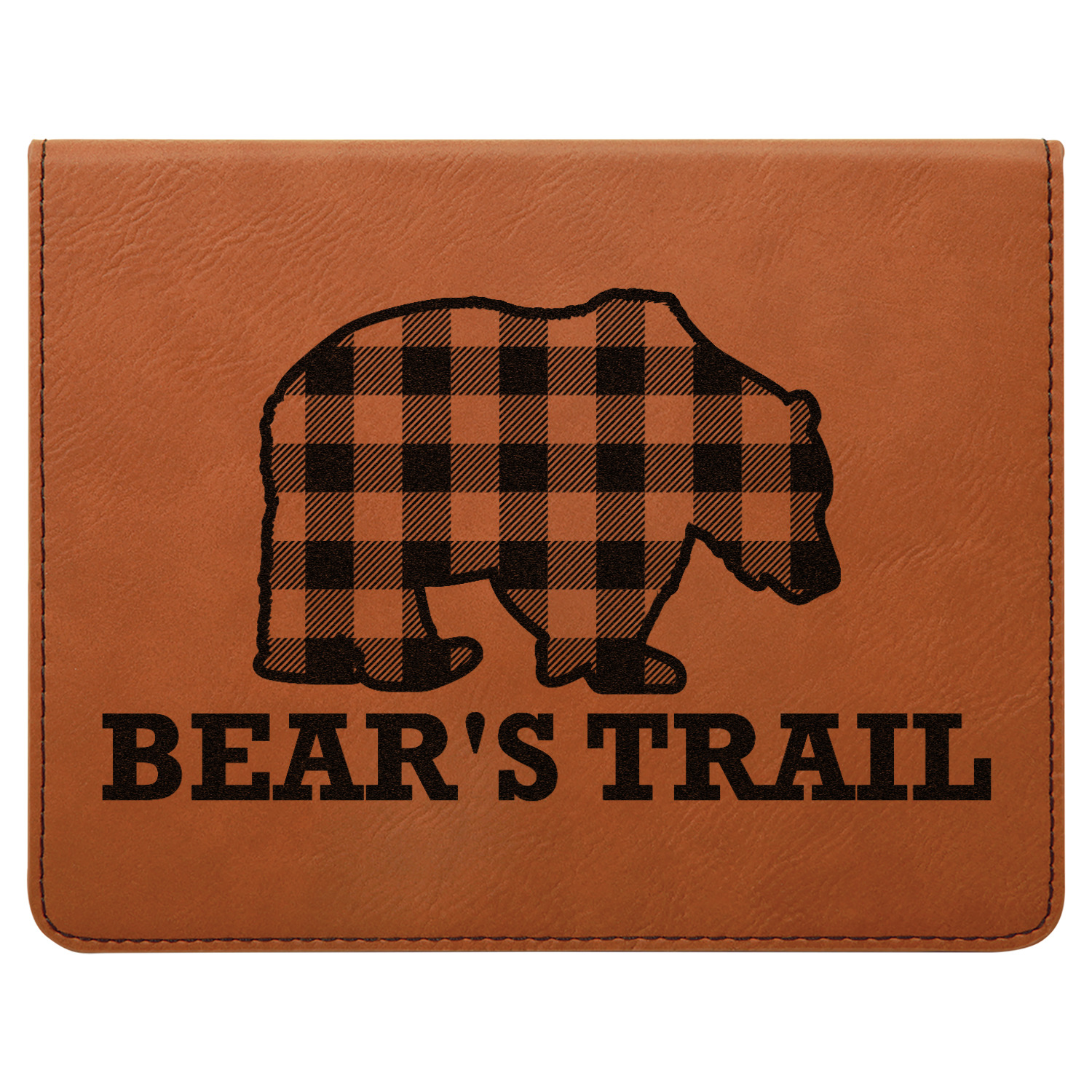 The main design is split into two asymmetrical sections. The top section is a diagonal red and black plaid, while the bottom is a light wood texture. On top of the wood texture is where your graphic and personalization go! The bear graphic and text below are filled with another black and red plaid.