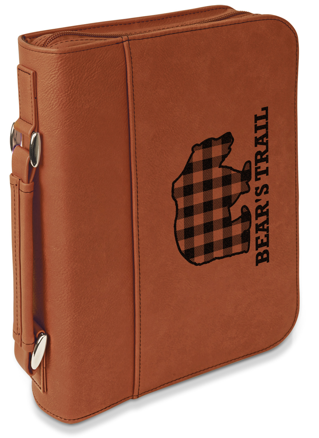 These book covers are fabricated from a fine leatherette in a warm, cognac shade of brown. A wide pocket spans across the front of the book jacket [2,400] and can store any loose papers or notes that you wish to keep. The interior of this personalized Bible cover includes slots on both sides to house the covers of your Bible, and keep it in place. The inside of the spine has a small elastic band to secure a pen. A zipper lines three sides of the cover, while the fourth side features a reinforced handle that allows for easy transport of your enclosed book.