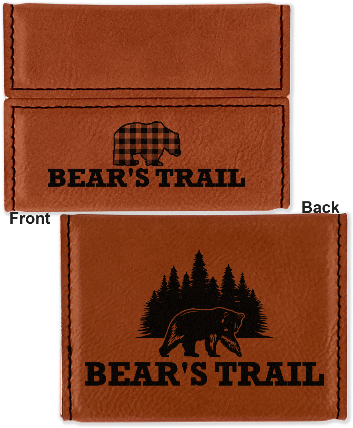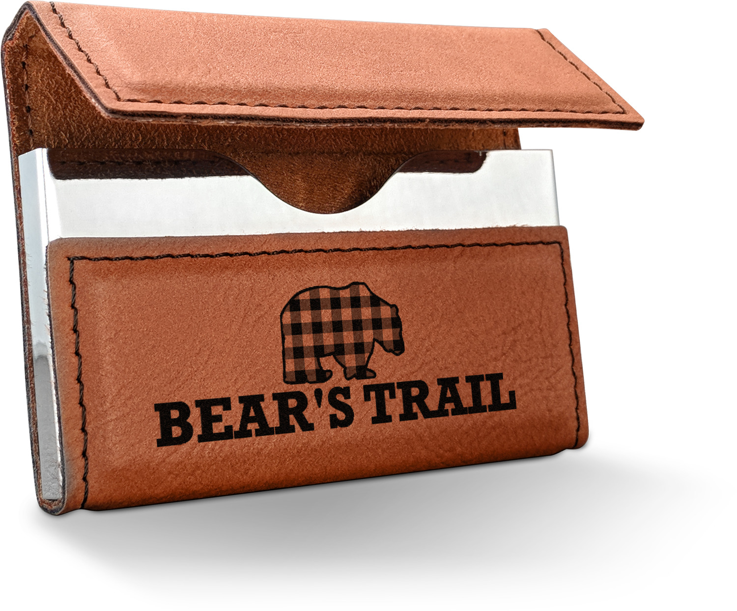 Your personalized design is laser engraved onto either the front, or the front and back of the card holder, depending on the model you purchase. Once engraved, the design will appear a darkened black against the cognac color of the leatherette.