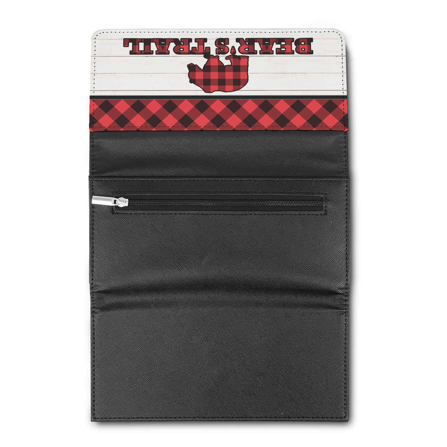 The main design is split into two asymmetrical sections. The top section is a diagonal red and black plaid, while the bottom is a light wood texture. On top of the wood texture is where your graphic and personalization go! The bear graphic and text below are filled with another black and red plaid.