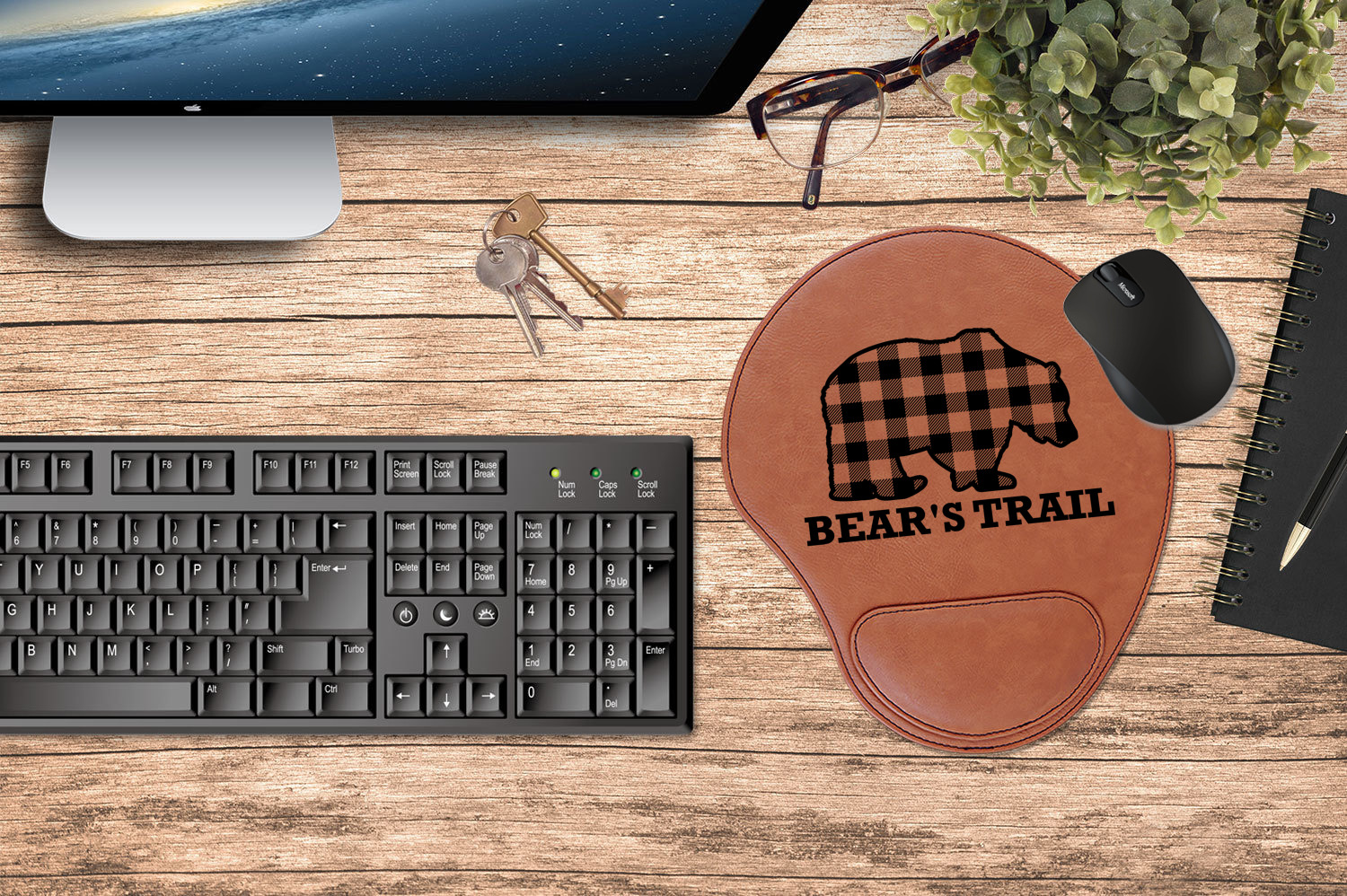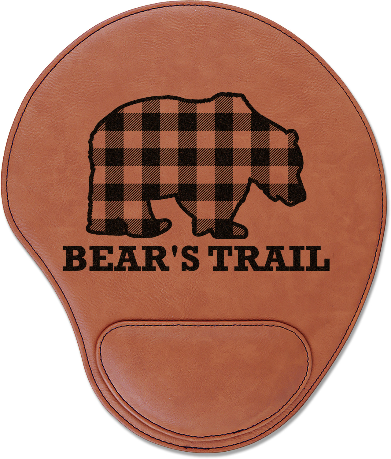 In a rounded shape, this mouse pad is made of a luxurious, cognac-colored leatherette. The nature of this material allows your mouse to glide smoothly across its surface. Strong stitching lines the edges to guarantee stability and strength. As added support for tired wrists, your personalized mouse pad features a supportive wrist rest at its bottom. This model measures at 10.25" x 9", while its wrist pad is approximately 5" x 2.75", with a thickness of 0.75". Your personalized design is laser engraved into the front face of this mouse pad.