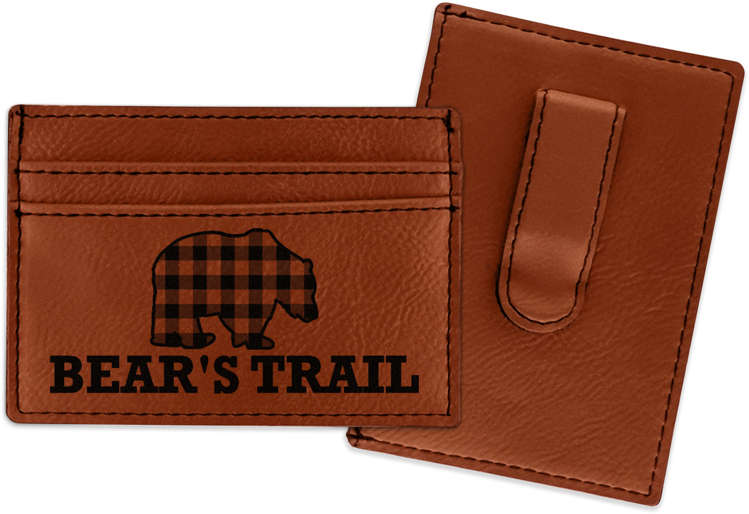 Made from a smooth brown leatherette material, these money clip wallets are the perfect accessory. They measure at approximately 4" x 2.75". On one side there is a money clip where you can slip in your cash. On the other side are three card slots for an ID and credit card or two. The money clip wallet will be laser engraved with your design on the side with the credit card slots. The graphic will come out as a black color.