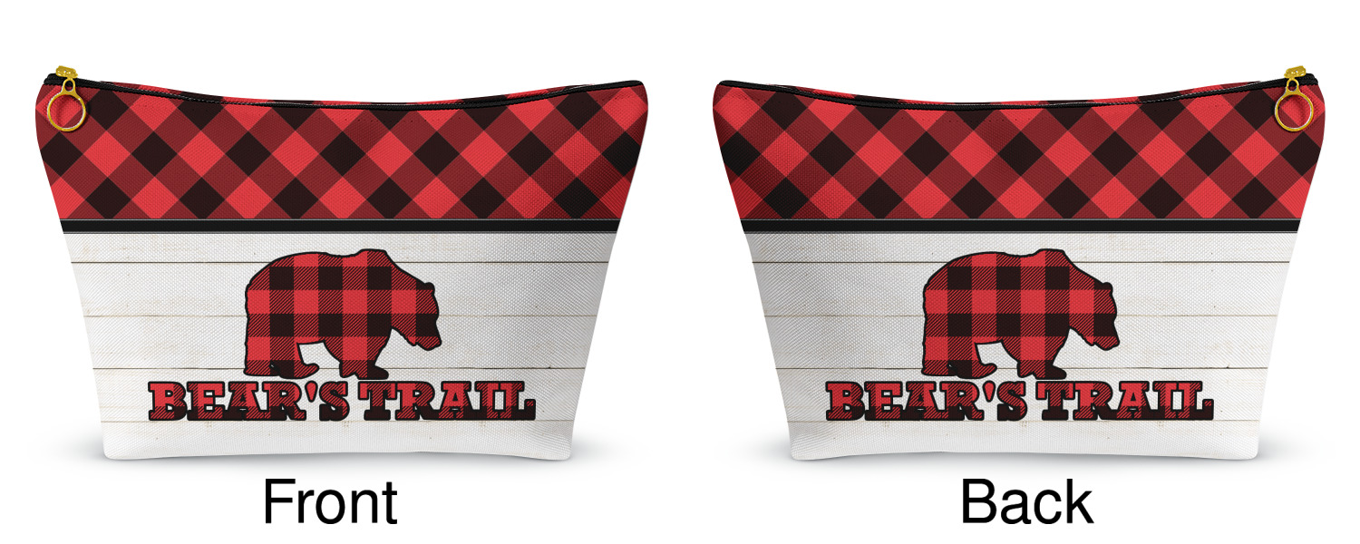 The main design is split into two asymmetrical sections. The top section is a diagonal red and black plaid, while the bottom is a light wood texture. On top of the wood texture is where your graphic and personalization go! The bear graphic and text below are filled with another black and red plaid.