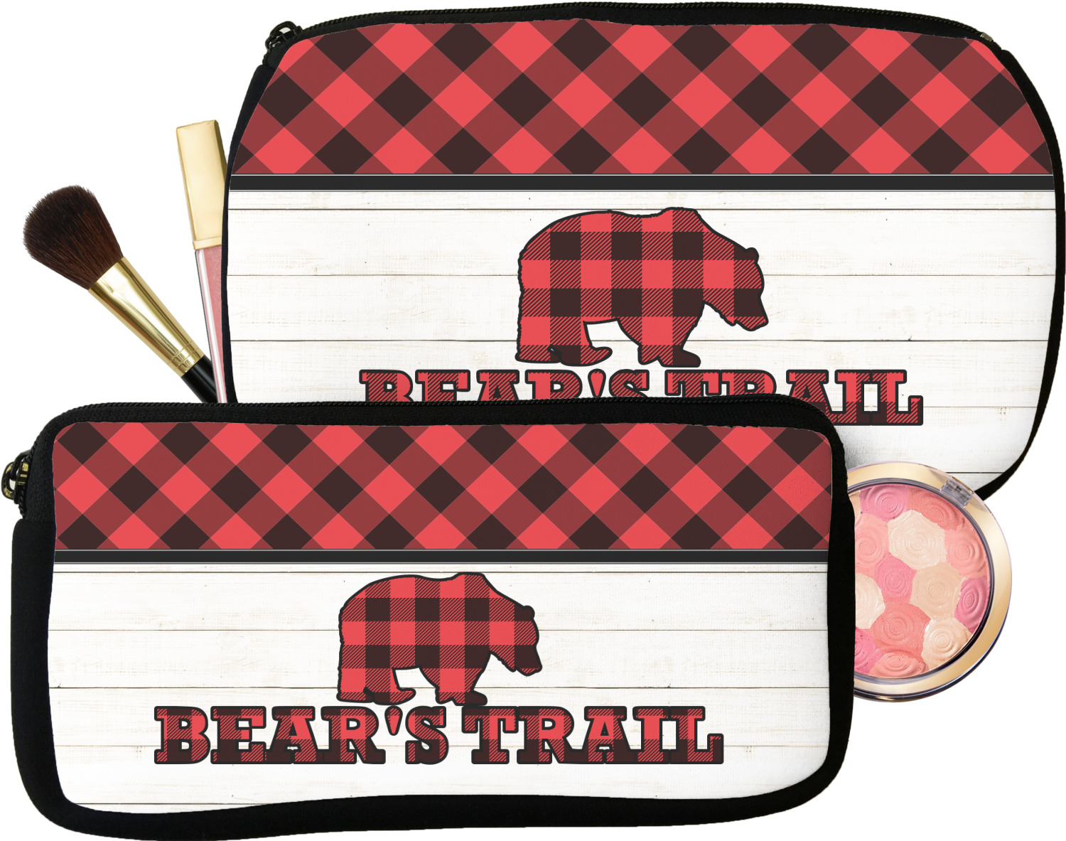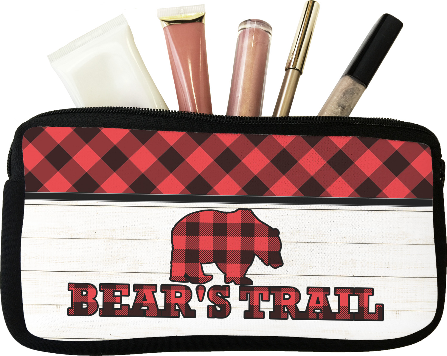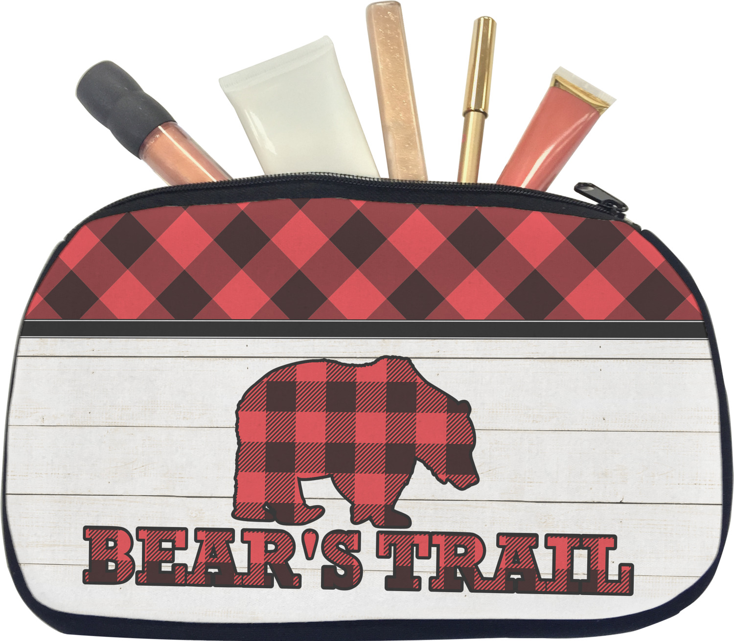 The main design is split into two asymmetrical sections. The top section is a diagonal red and black plaid, while the bottom is a light wood texture. On top of the wood texture is where your graphic and personalization go! The bear graphic and text below are filled with another black and red plaid.