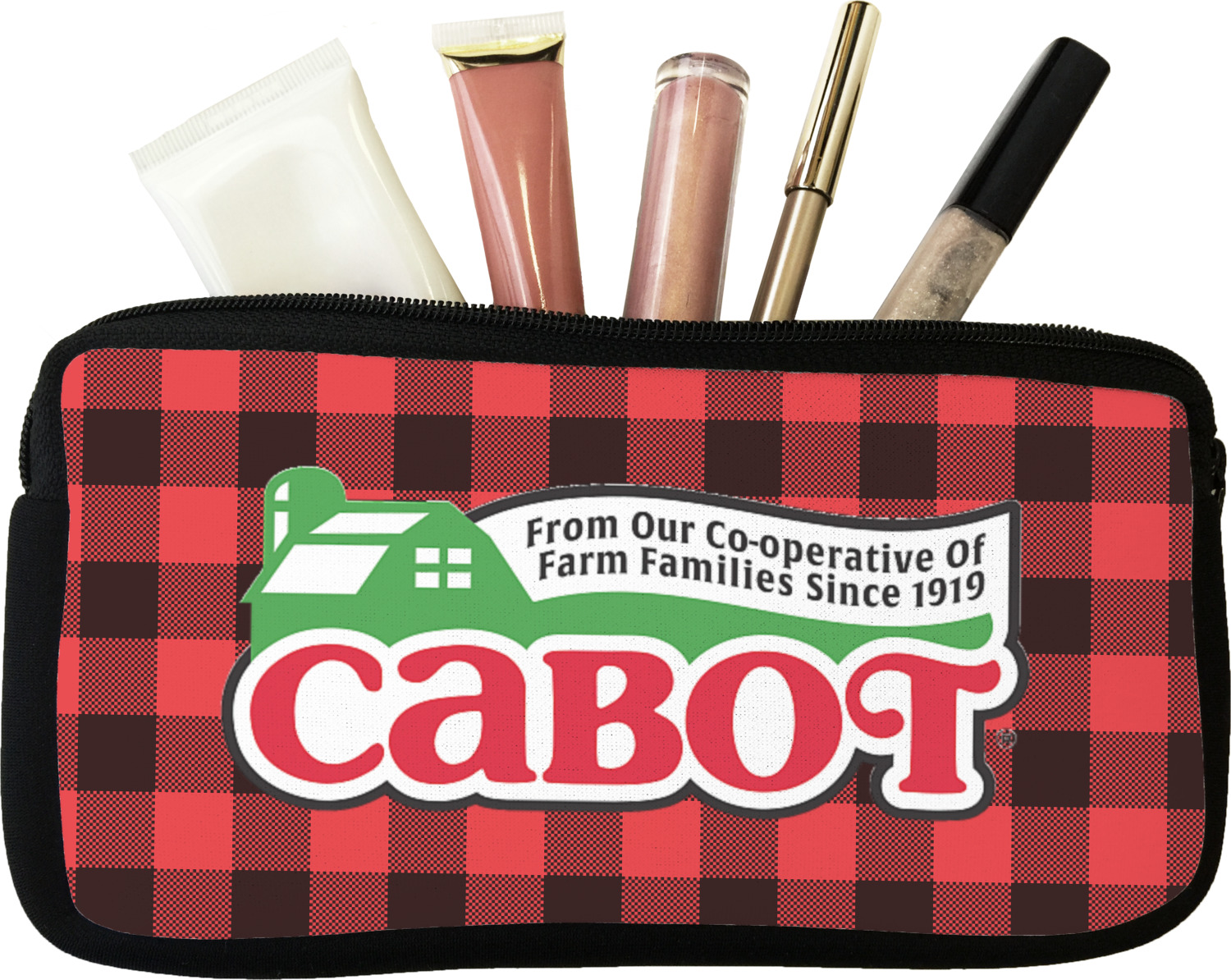 Our personalized makeup bags are available in many different designs, patterns and colors - so you are sure to find one that will love. They are made of neoprene (same material as wet-suits) and thus are water resistant, so spillages in your makeup bag will not end up all over you purse. They are customized on one side and are black on the other side and the zipper is black as well.