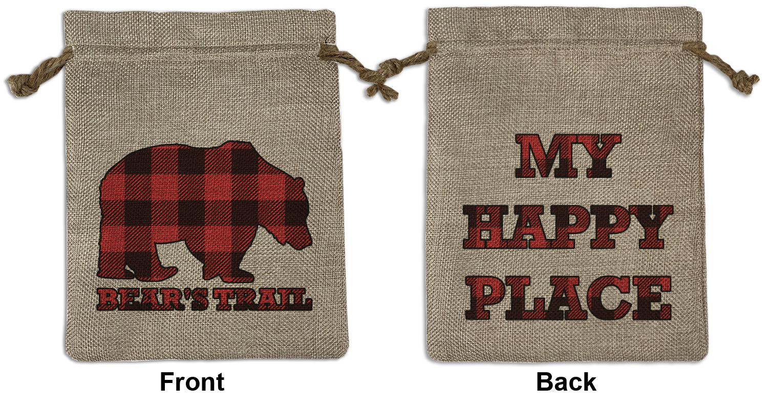 We sell our Burlap Gift Bags in 3 variant sized bags. Made with burlap polyester, each personalized bag can be secured with a twine drawstring pull. Your custom design is available to print on one side or both sides - completely up to you! The sizes of the bags measure approximately 4.5" x 6.5" for the smallest size, 6.5" x 8.0" for the medium size, and 6.5" x 13.5" for the large-sized bag.