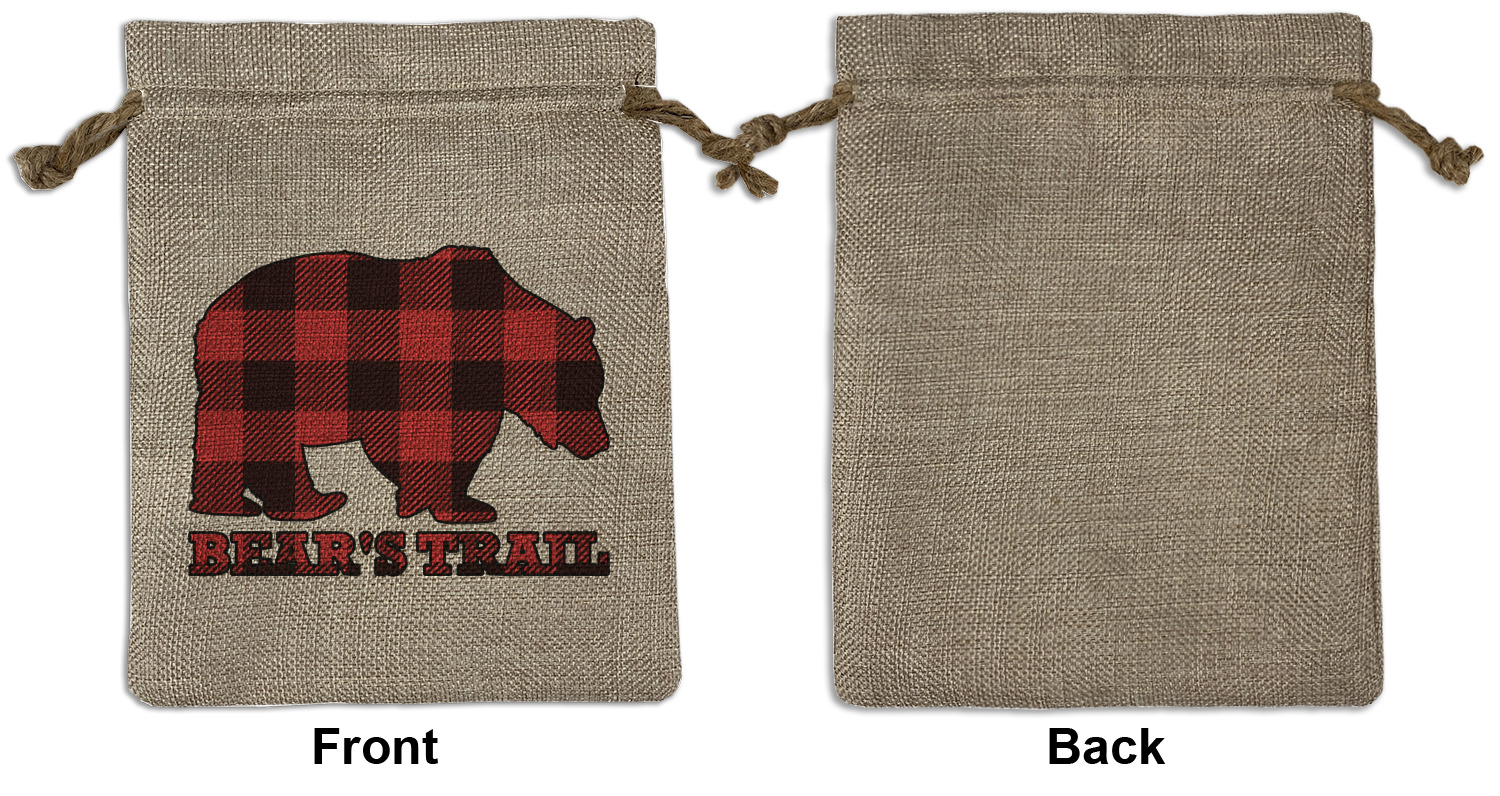 We sell our Burlap Gift Bags in 3 variant sized bags. Made with burlap polyester, each personalized bag can be secured with a twine drawstring pull. Your custom design is available to print on one side or both sides - completely up to you! The sizes of the bags measure approximately 4.5" x 6.5" for the smallest size, 6.5" x 8.0" for the medium size, and 6.5" x 13.5" for the large-sized bag.
