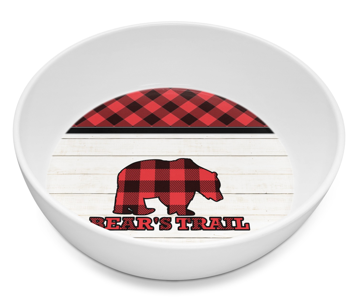 The main design is split into two asymmetrical sections. The top section is a diagonal red and black plaid, while the bottom is a light wood texture. On top of the wood texture is where your graphic and personalization go! The bear graphic and text below are filled with another black and red plaid.