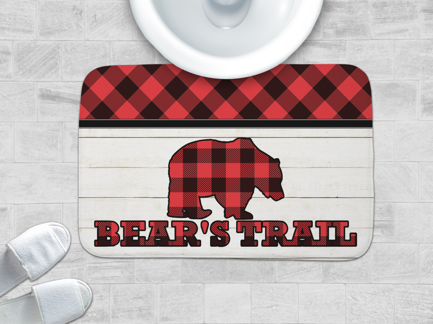 The main design is split into two asymmetrical sections. The top section is a diagonal red and black plaid, while the bottom is a light wood texture. On top of the wood texture is where your graphic and personalization go! The bear graphic and text below are filled with another black and red plaid.