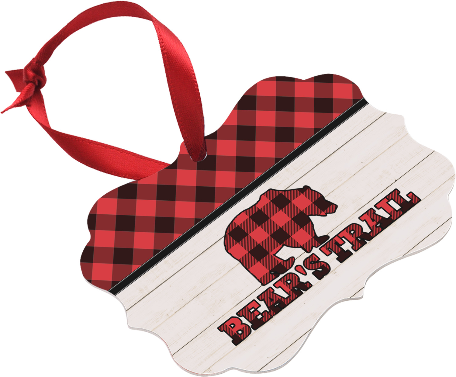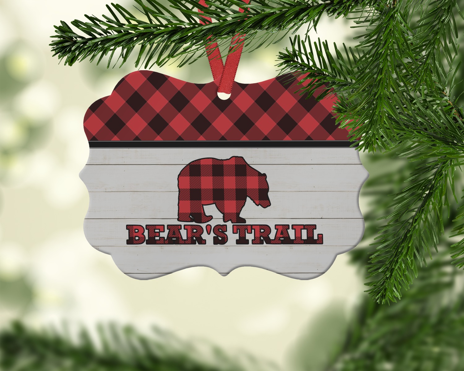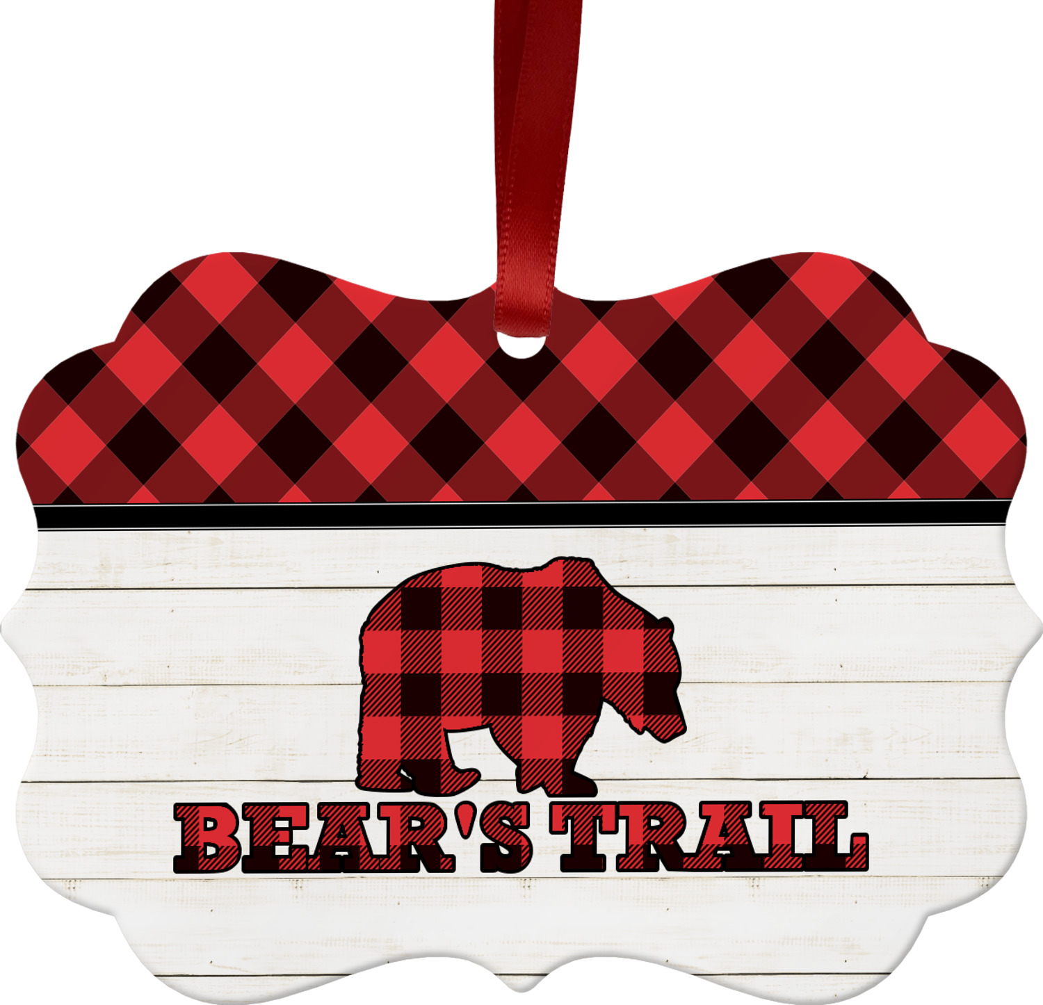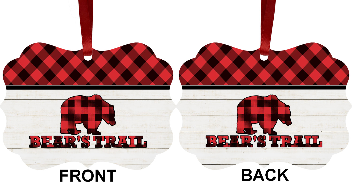 The main design is split into two asymmetrical sections. The top section is a diagonal red and black plaid, while the bottom is a light wood texture. On top of the wood texture is where your graphic and personalization go! The bear graphic and text below are filled with another black and red plaid.