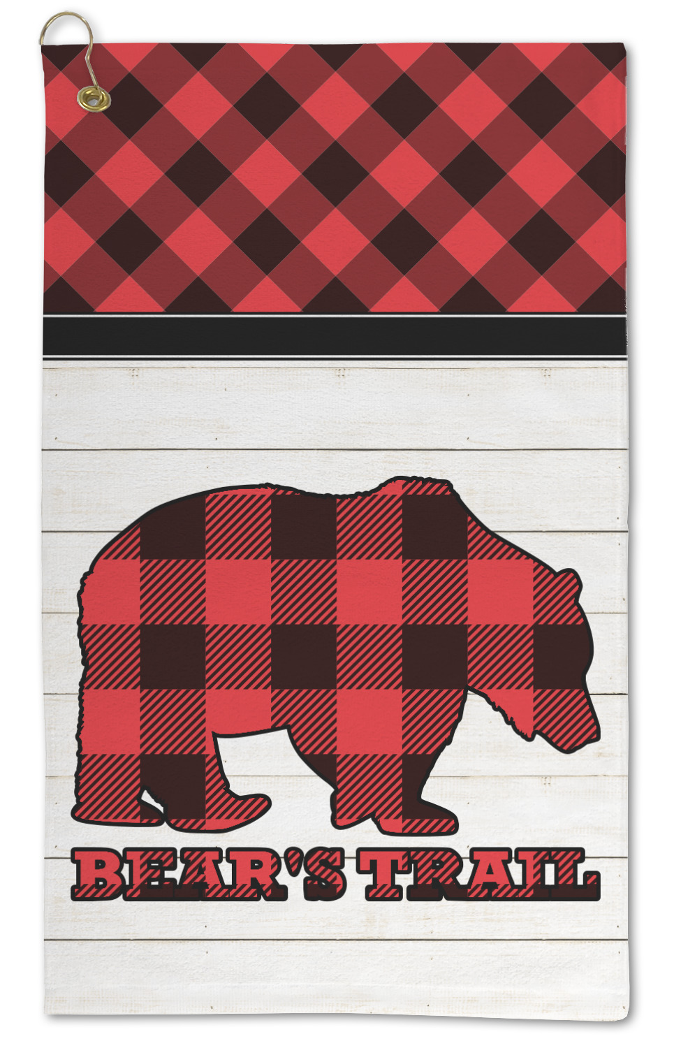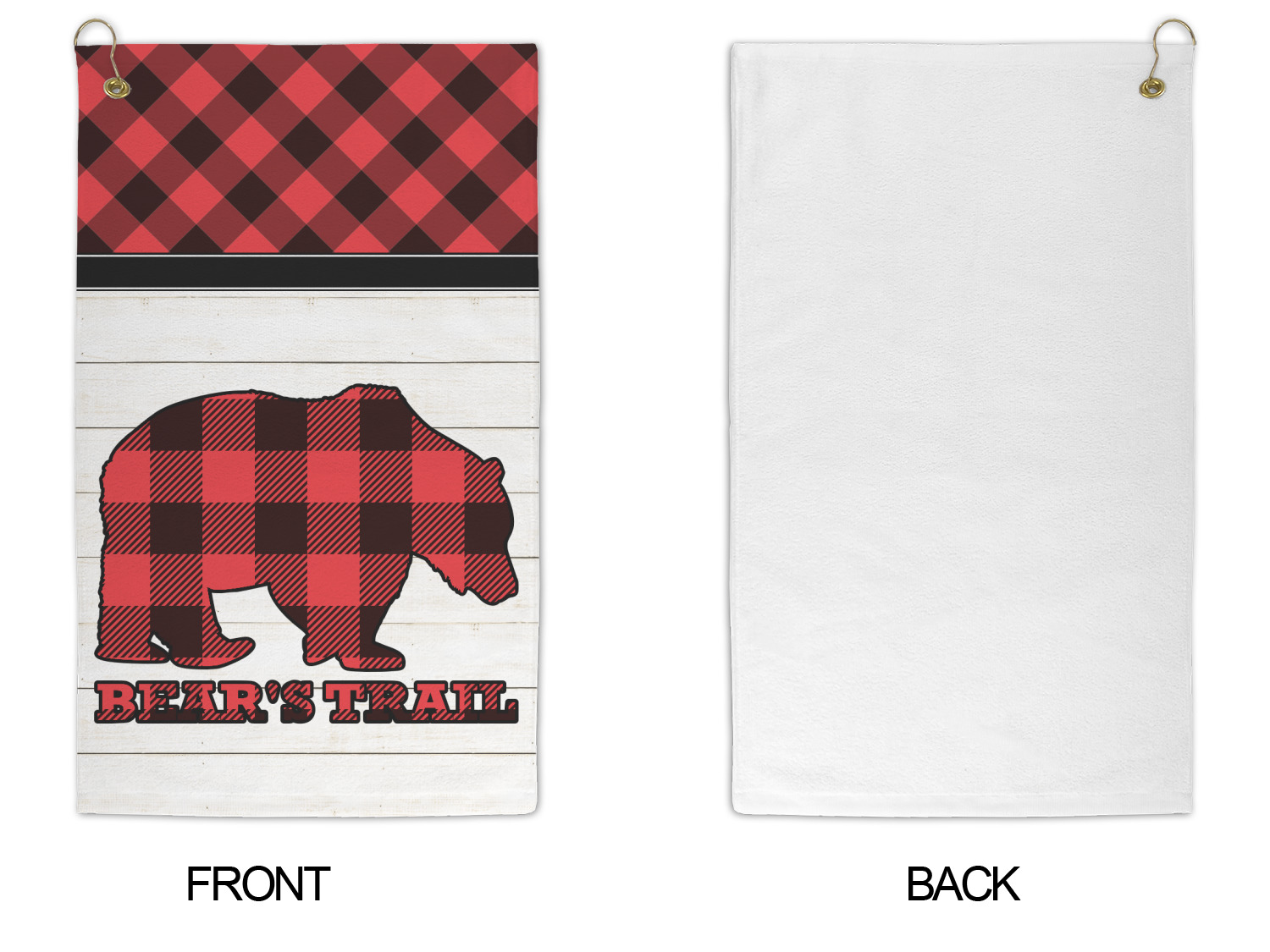 The main design is split into two asymmetrical sections. The top section is a diagonal red and black plaid, while the bottom is a light wood texture. On top of the wood texture is where your graphic and personalization go! The bear graphic and text below are filled with another black and red plaid.