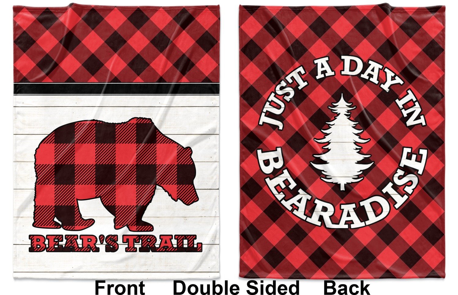 The main design is split into two asymmetrical sections. The top section is a diagonal red and black plaid, while the bottom is a light wood texture. On top of the wood texture is where your graphic and personalization go! The bear graphic and text below are filled with another black and red plaid.