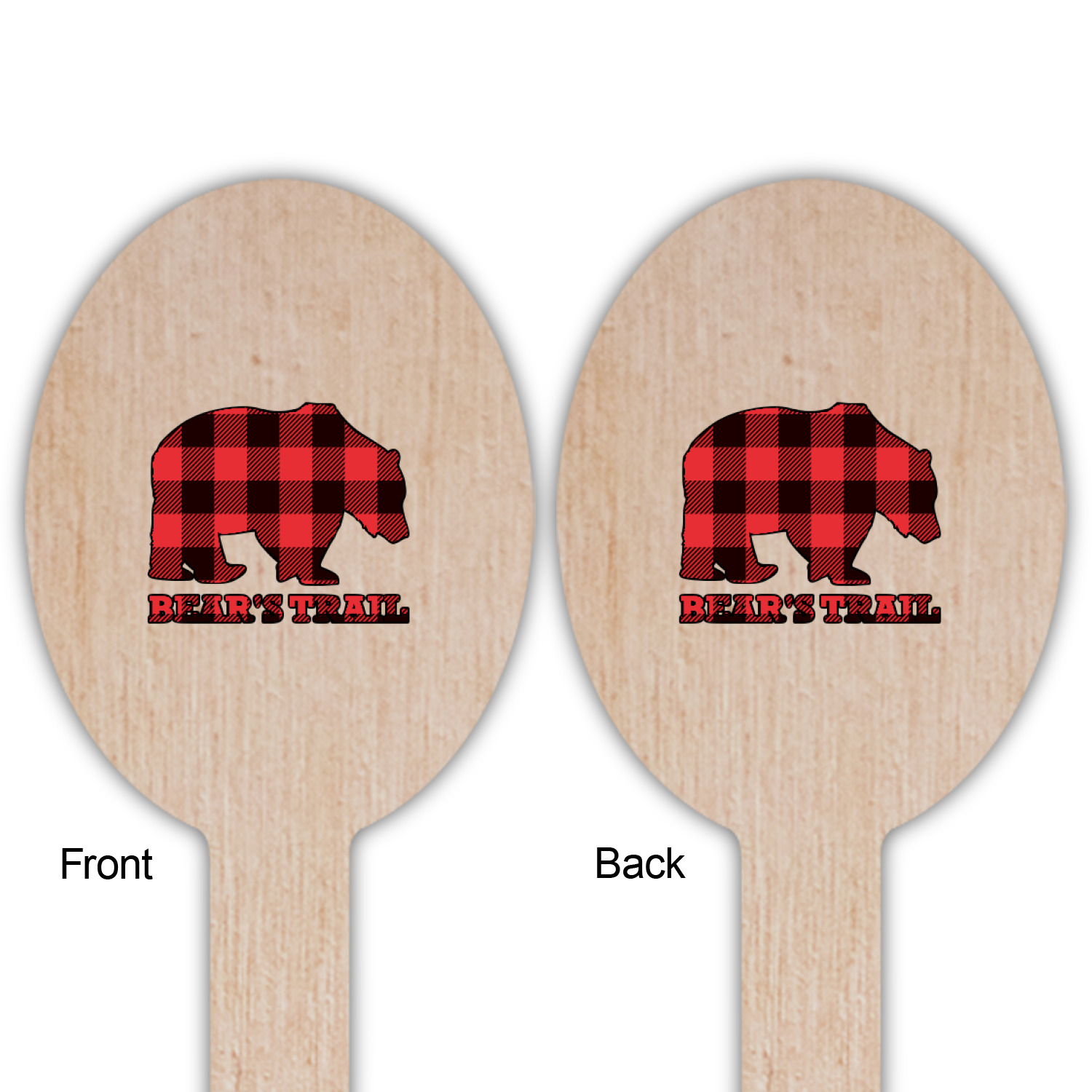 The main design is split into two asymmetrical sections. The top section is a diagonal red and black plaid, while the bottom is a light wood texture. On top of the wood texture is where your graphic and personalization go! The bear graphic and text below are filled with another black and red plaid.