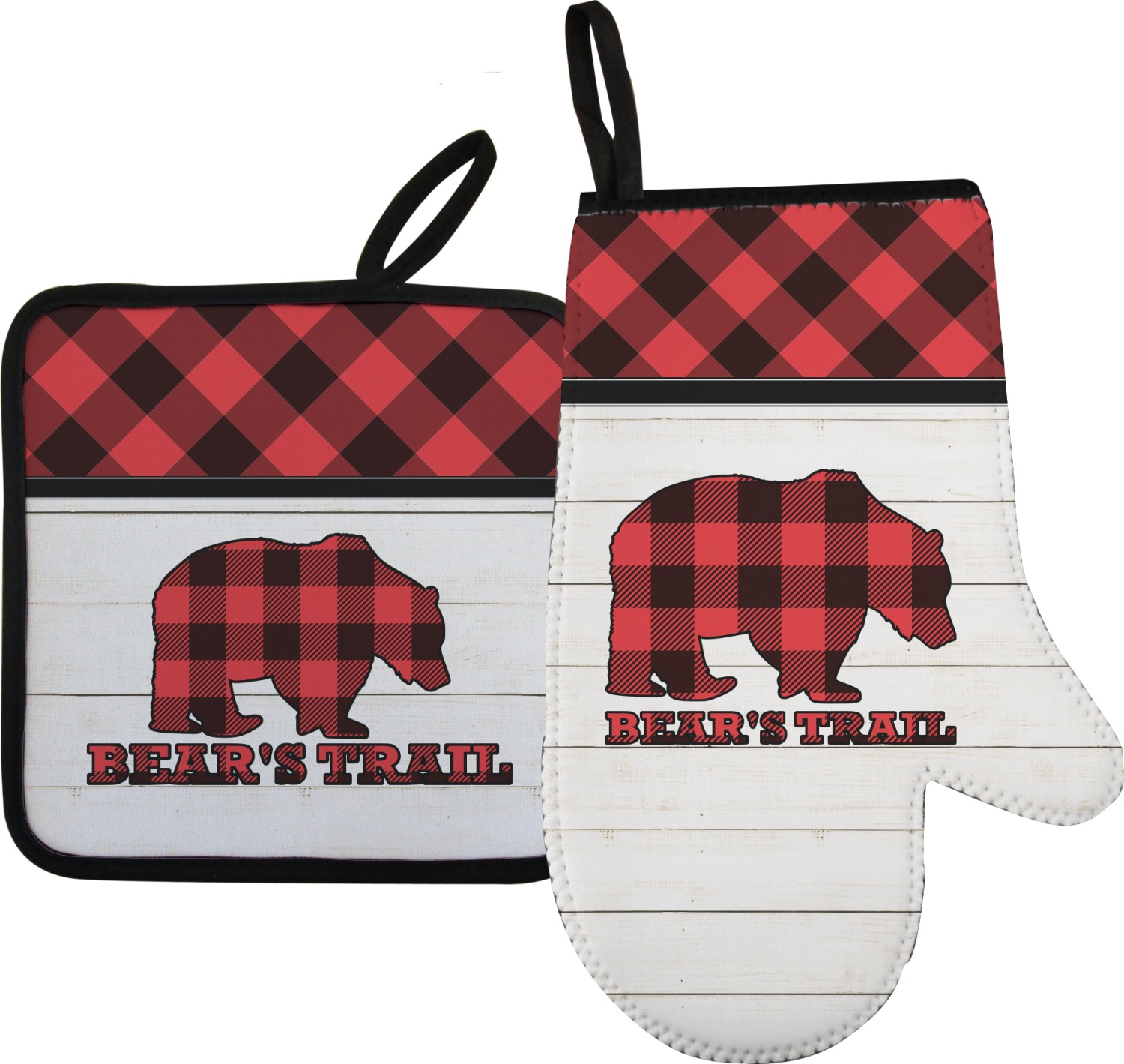 The main design is split into two asymmetrical sections. The top section is a diagonal red and black plaid, while the bottom is a light wood texture. On top of the wood texture is where your graphic and personalization go! The bear graphic and text below are filled with another black and red plaid.