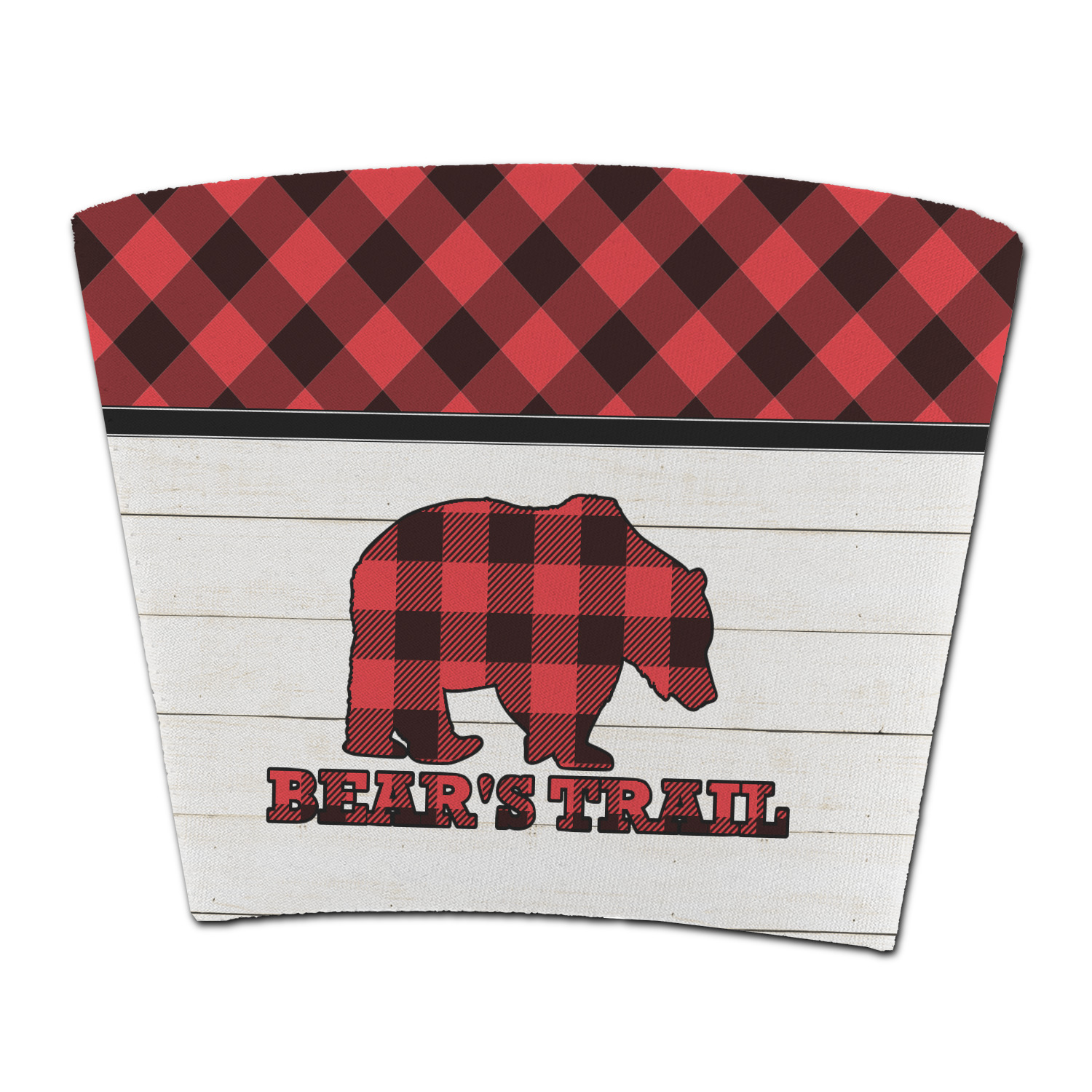 The main design is split into two asymmetrical sections. The top section is a diagonal red and black plaid, while the bottom is a light wood texture. On top of the wood texture is where your graphic and personalization go! The bear graphic and text below are filled with another black and red plaid.