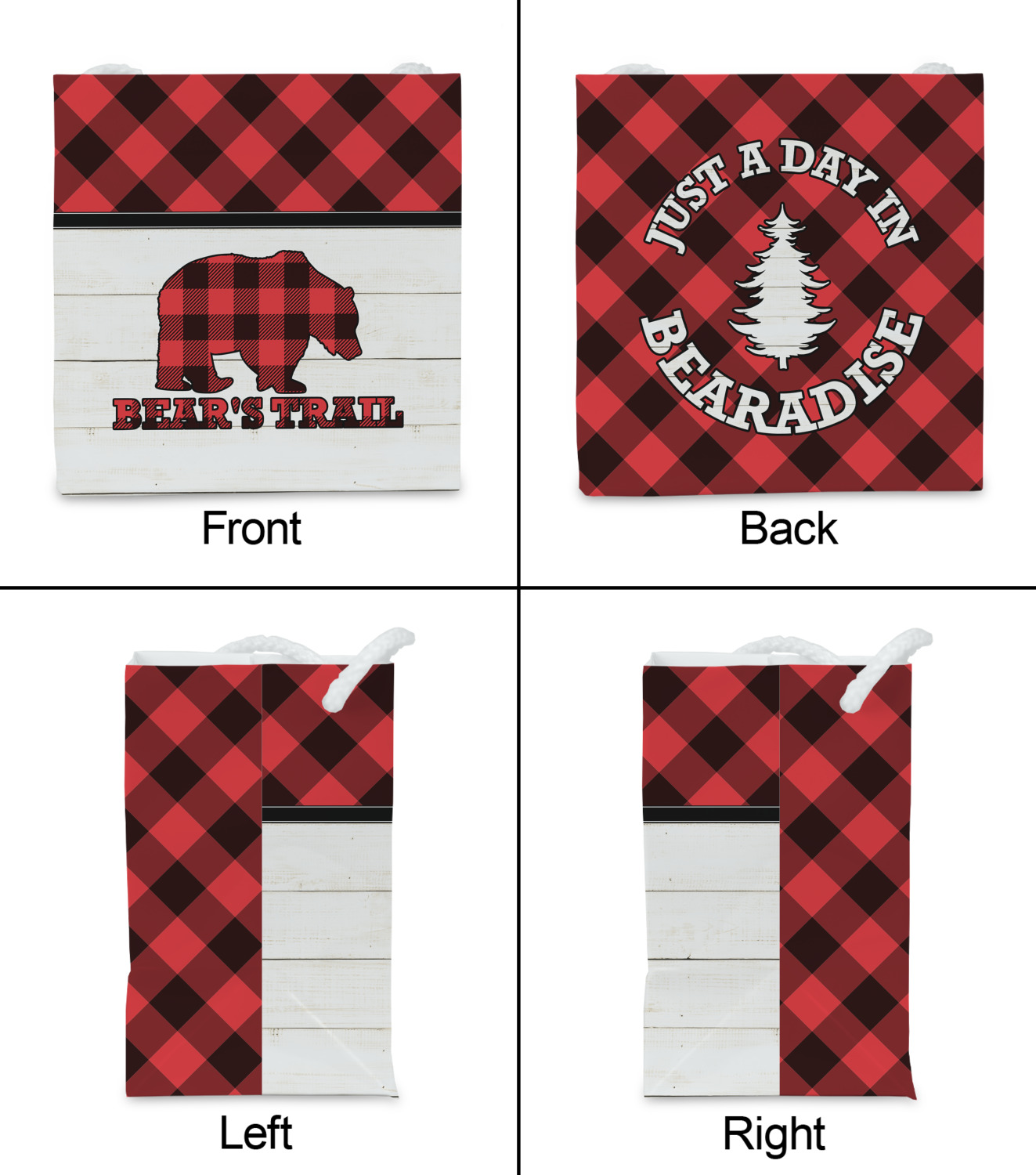 The main design is split into two asymmetrical sections. The top section is a diagonal red and black plaid, while the bottom is a light wood texture. On top of the wood texture is where your graphic and personalization go! The bear graphic and text below are filled with another black and red plaid.